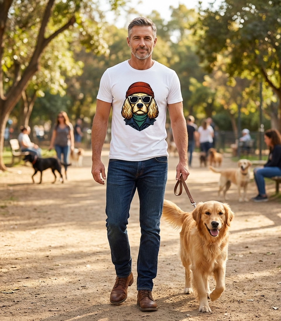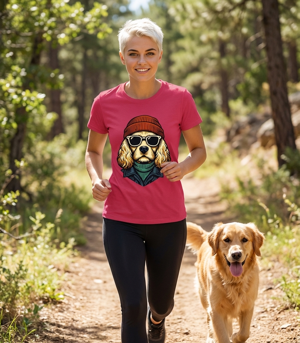 This unique t-shirt artwork features a stylish dog, possibly a Golden Retriever or Cocker Spaniel, sporting a vibrant orange beanie, classic black sunglasses, and a cool teal turtleneck under a dark jacket. The illustration combines a retro aesthetic with a modern, laid-back vibe.