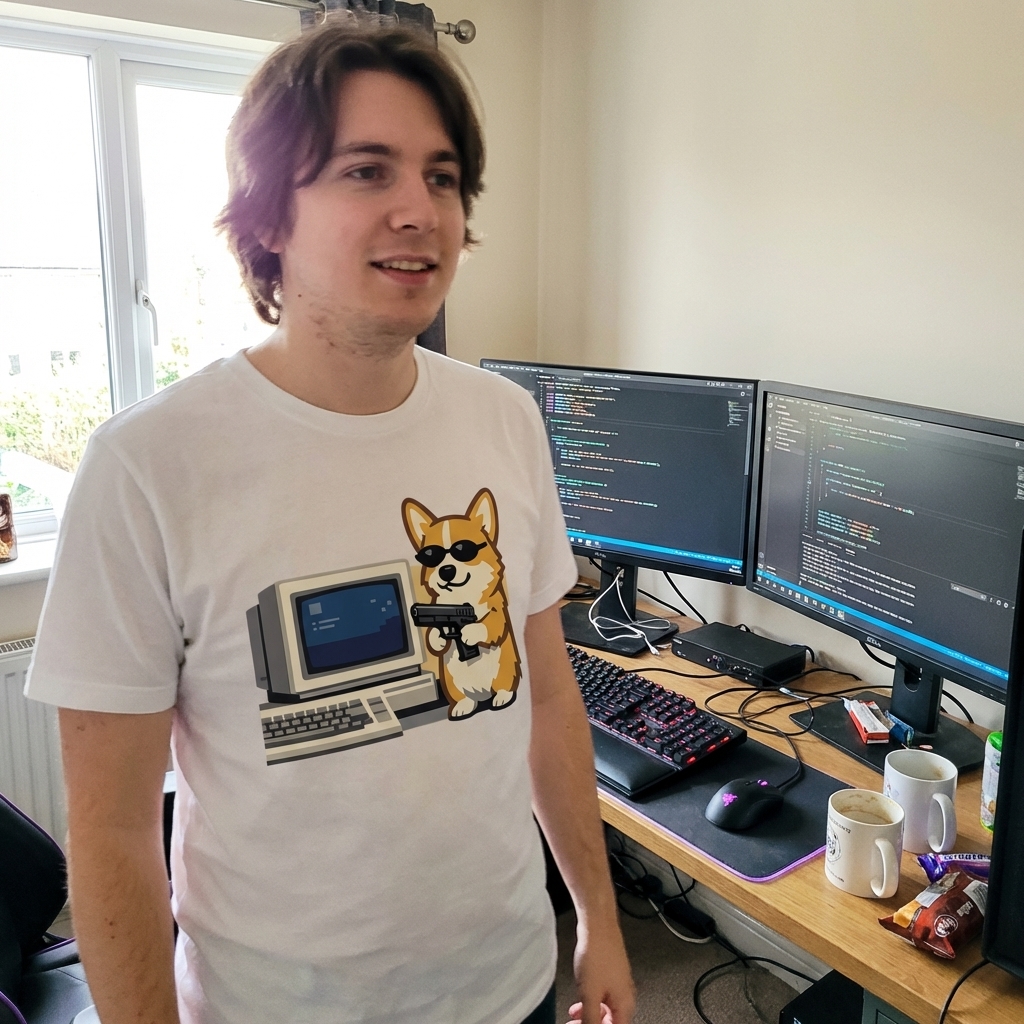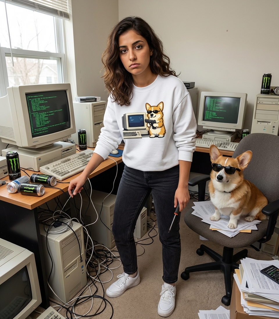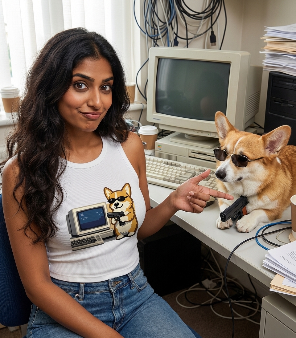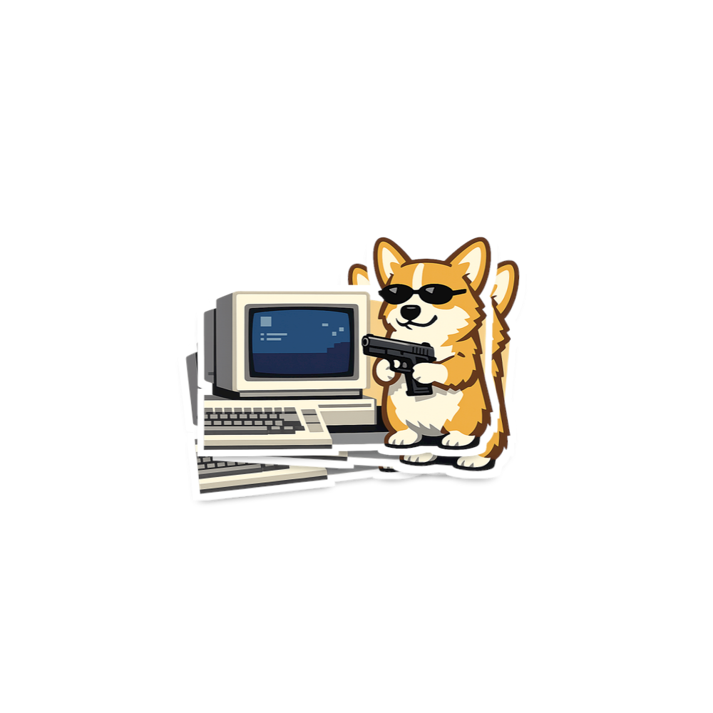 This striking graphic features a confident corgi, accessorized with sleek sunglasses and a small pistol, posed next to a vintage desktop computer. The artwork combines cute animal appeal with a retro tech aesthetic and a touch of humorous edginess. It's a playful representation of unexpected digital prowess.