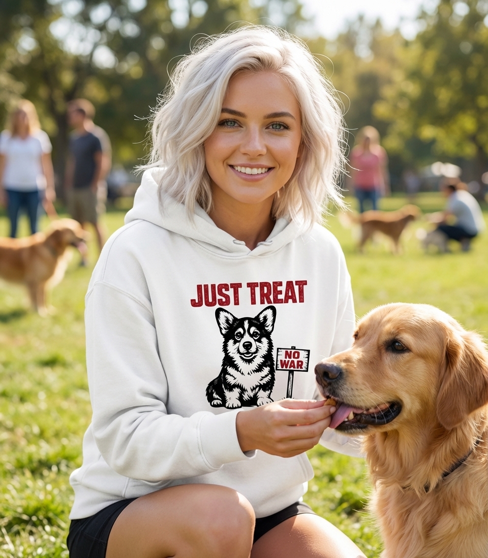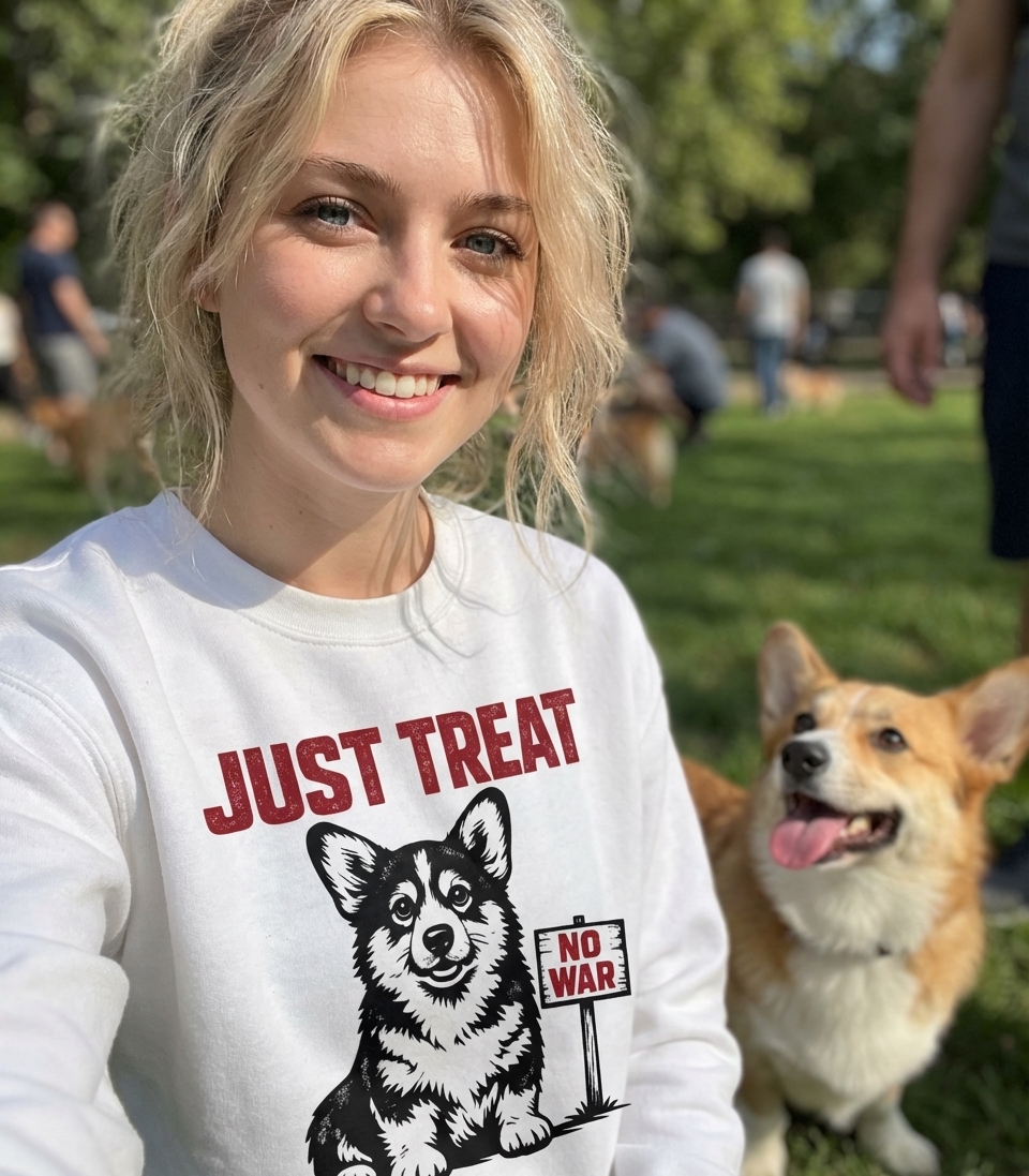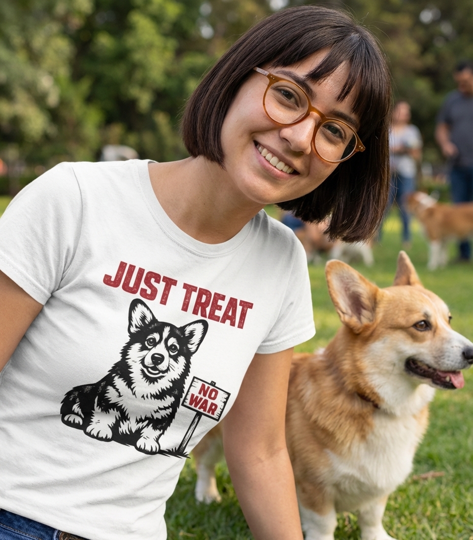 Got my corgi tee today and it's seriously adorable. The 'just treat no war' message is so good, total happy vibes without being too in-your-face. Fabric feels great too, very pleased!