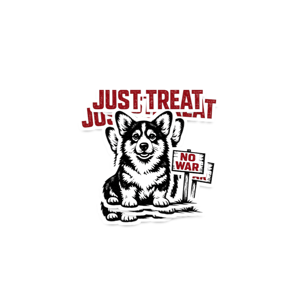 This design features an adorable black and white corgi sitting cheerfully. Next to the dog, a small hand-held sign boldly declares "NO WAR." Above this heartwarming scene, the distressed red text proclaims "JUST TREAT," offering a lighthearted yet profound message.