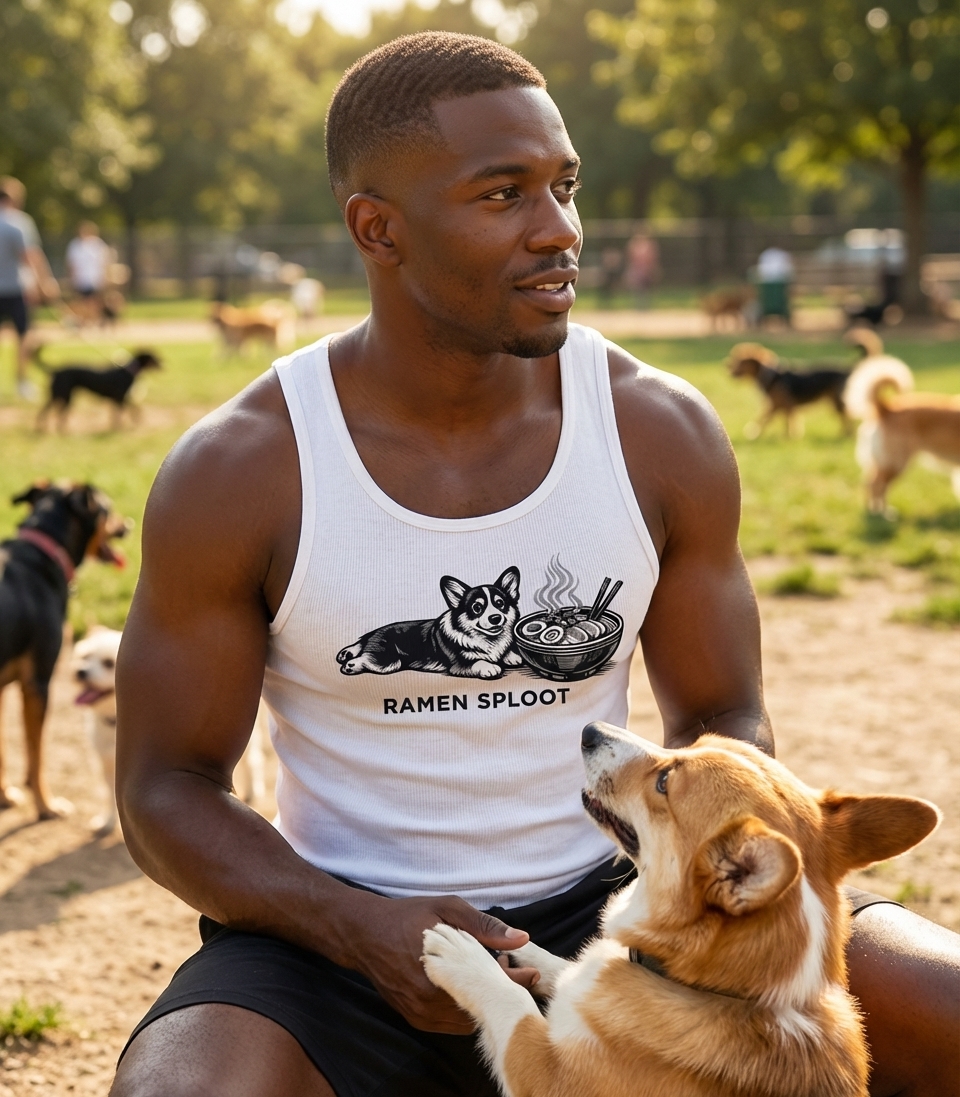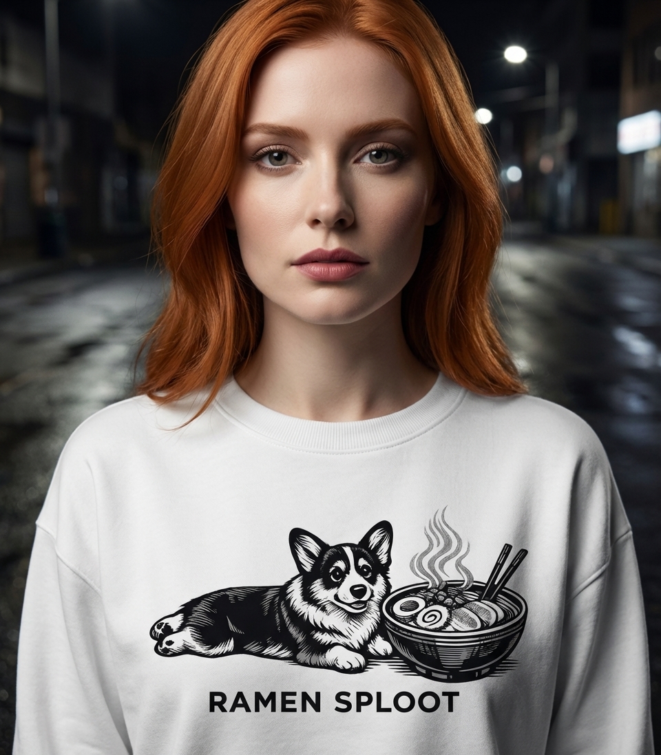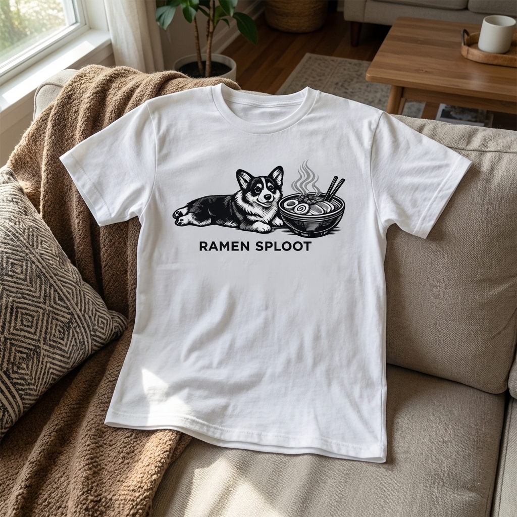 The phrase "Ramen Sploot" is a playful fusion of popular culture. "Ramen" refers to the popular Japanese noodle soup, while "sploot" describes an endearing posture where a dog lies on its belly with its hind legs stretched out behind it. The combination celebrates both culinary enjoyment and the unique charm of corgis.