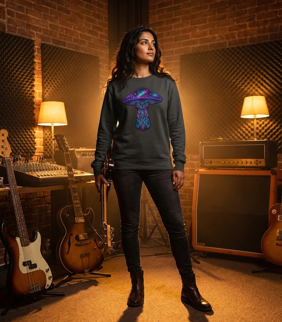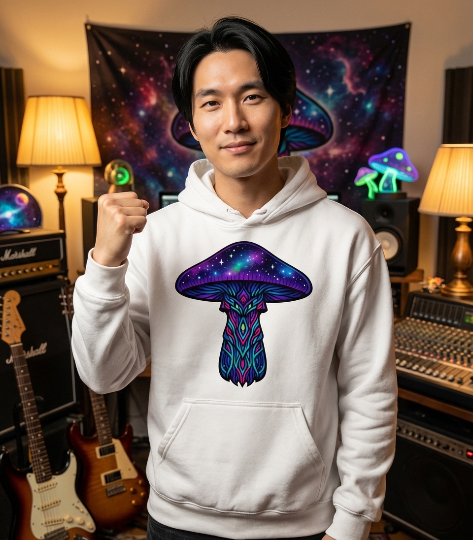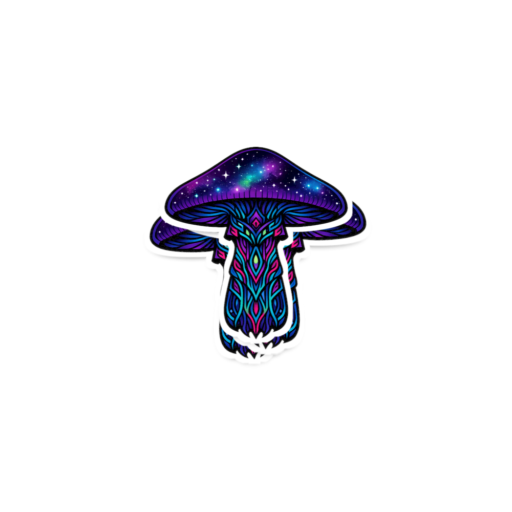This cosmic mushroom design captures the imaginative spirit of those who appreciate vibrant art, mystical themes, and otherworldly aesthetics.