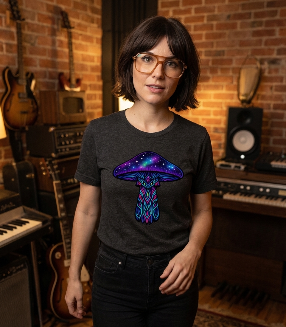 This striking graphic features an artistically rendered mushroom, showcasing a fantastical blend of nature and the cosmos. The design captures attention with its vivid color palette and detailed artistry.