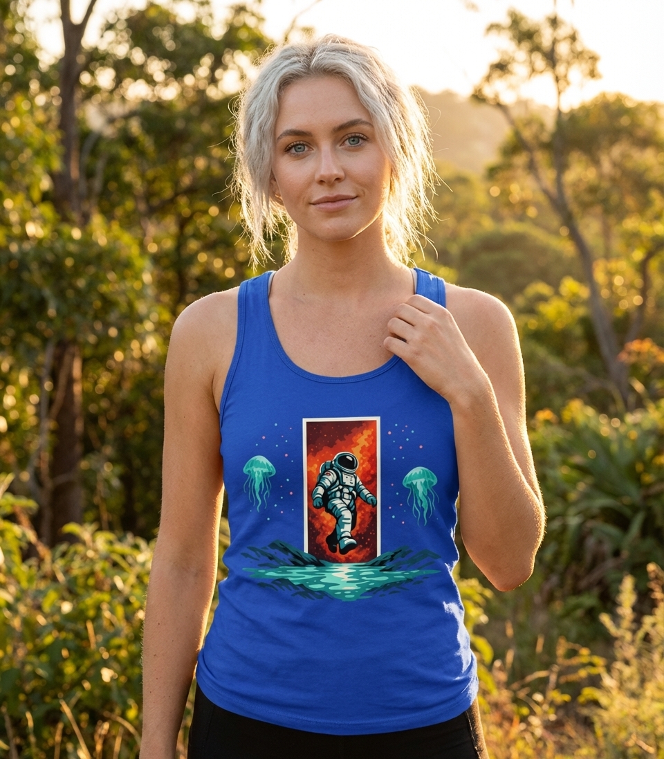 This captivating design illustrates an astronaut in a white suit boldly stepping out of a glowing, fiery portal and into a dark, watery landscape. The scene is illuminated by bioluminescent jellyfish and floating particles, creating a sense of wonder and mystery.