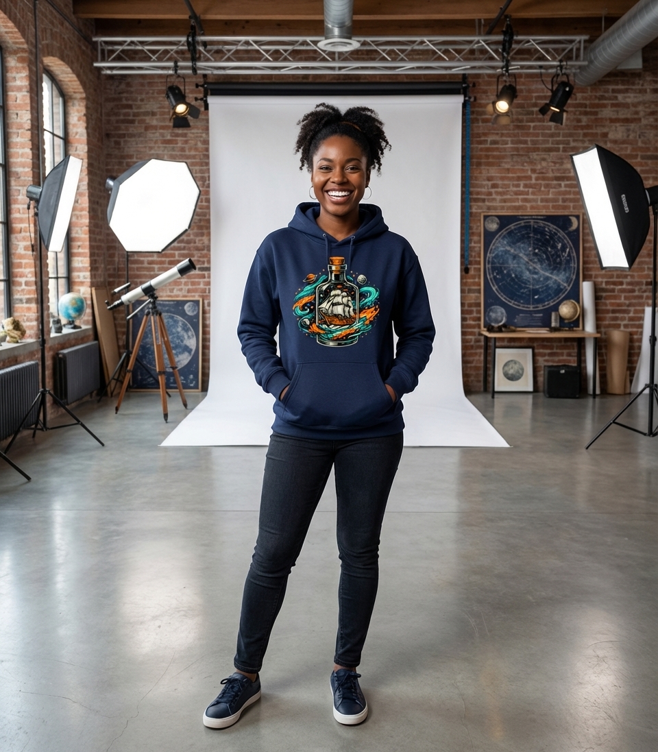 The design invites viewers into a realm of boundless imagination, where the wonders of seafaring adventure meet the mysteries of outer space. It's a visual metaphor for carrying an entire universe of dreams and journeys within oneself.