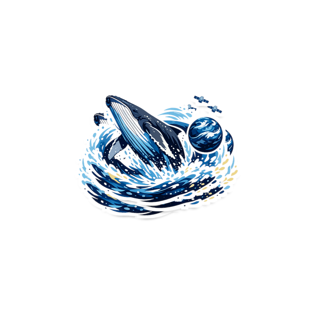 This artwork presents a captivating visual narrative where a majestic whale emerges from a tumultuous sea, which seamlessly transforms into a celestial expanse. Adjacent to the breaching whale, a stylized planet, reminiscent of Earth, swirls with blues and whites, further blurring the lines between ocean depths and outer space. A small satellite in the background reinforces the cosmic theme.
