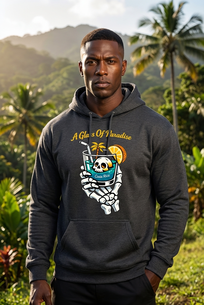 This unique graphic features a skeleton hand holding a vibrant tropical cocktail, complete with a straw, an orange slice, and a floating skull. The drink is labeled "Costa Rica" and the design is topped with the phrase "A Glass Of Paradise". It evokes a fun, relaxed, and slightly macabre vacation vibe, perfect for those with a quirky sense of humor and a love for travel.