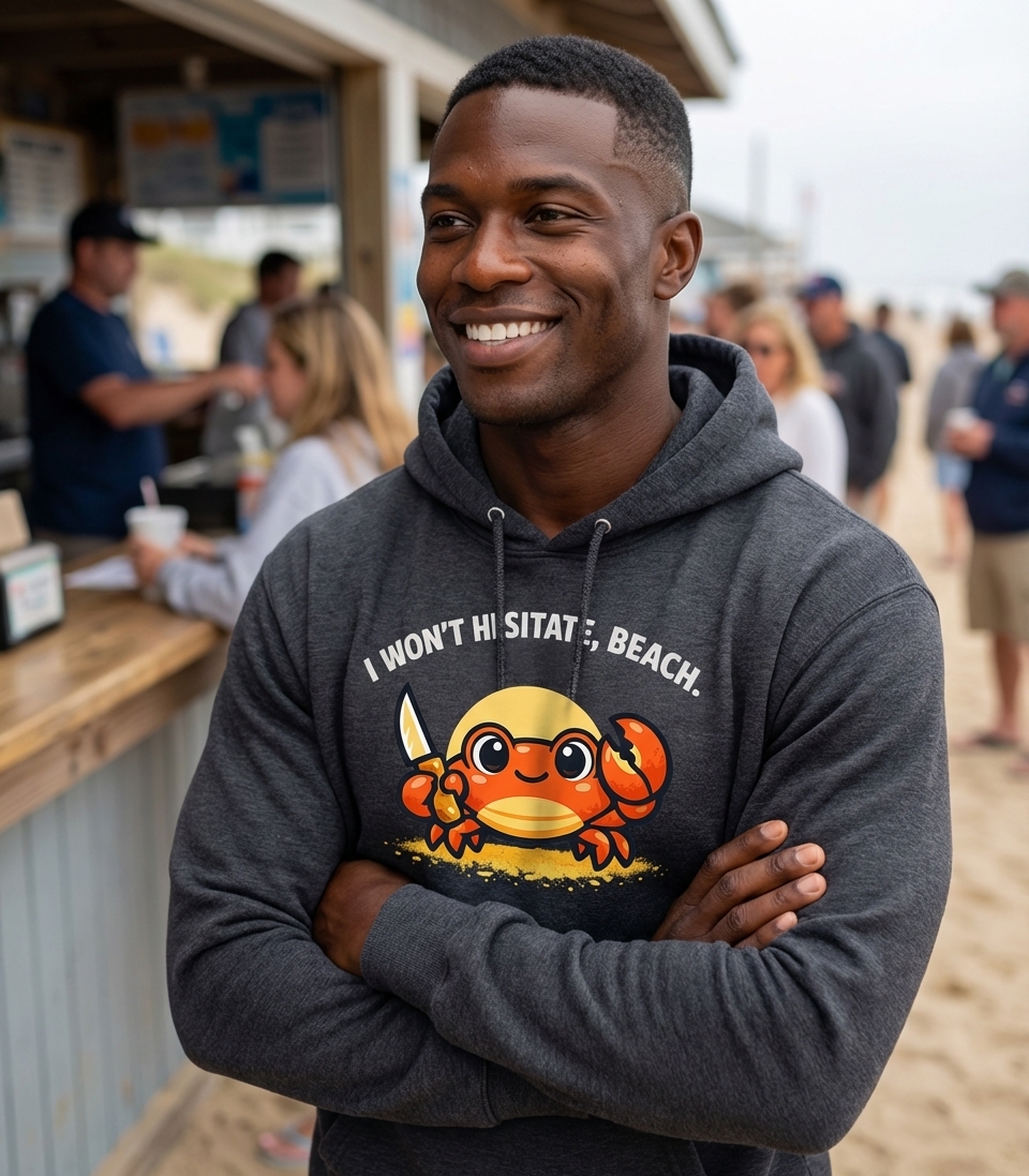 The design is centered around the humorous phrase "I WON'T HESITATE, BEACH." written above the crab in a slightly distressed, bold font, making it a perfect blend of cute and cheeky.