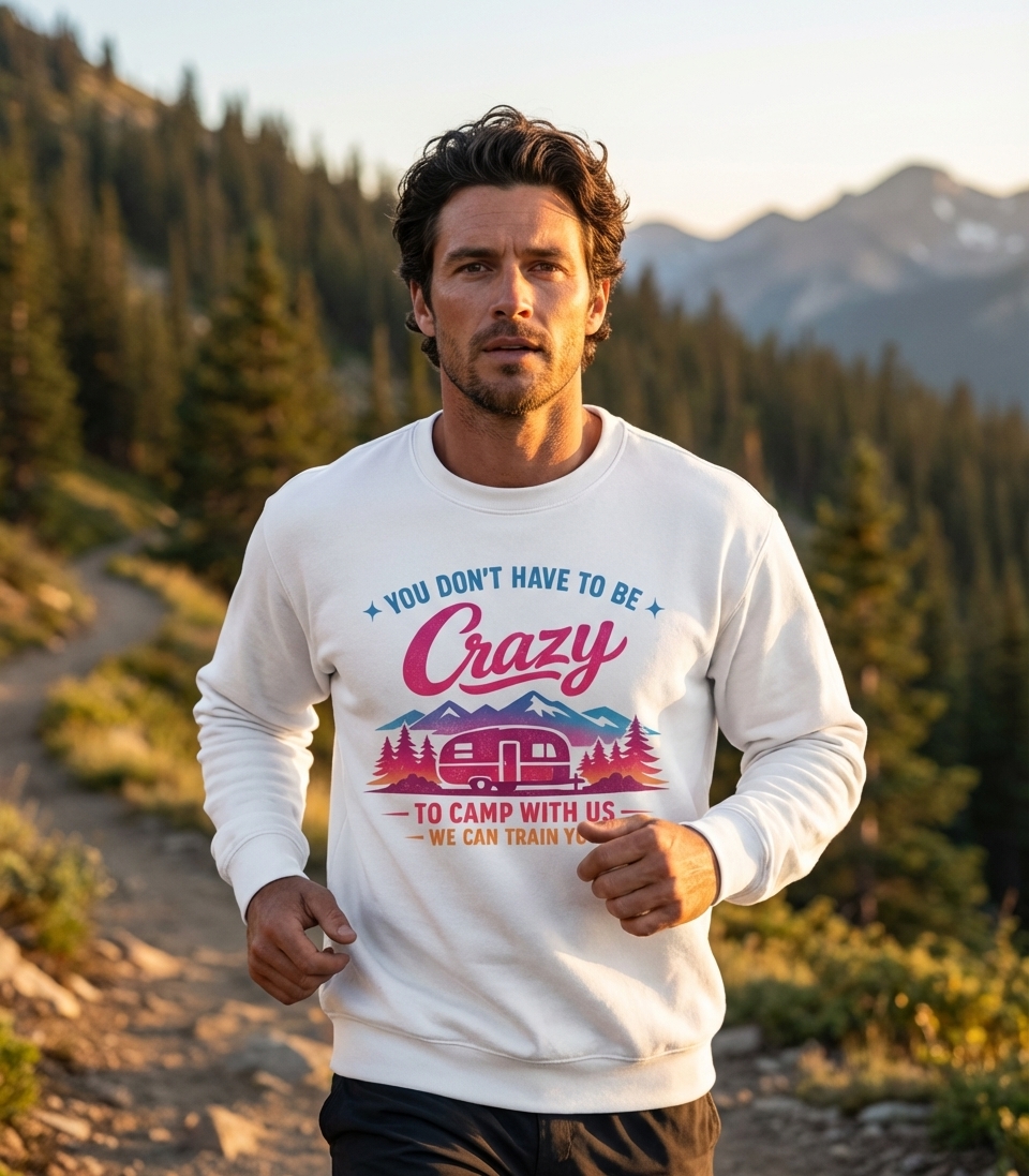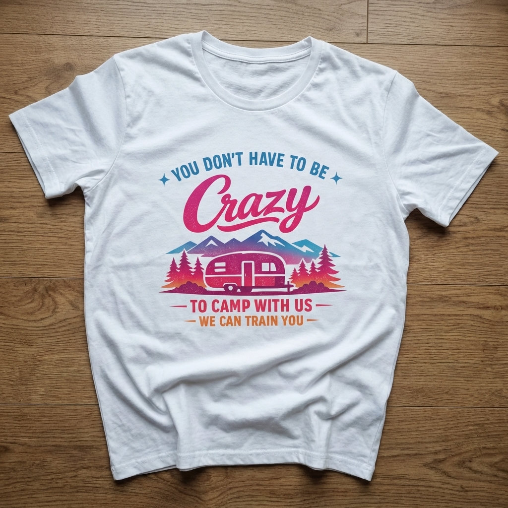 The 'You Don't Have To Be Crazy To Camp With Us' phrase captures the lifestyle of passionate outdoor enthusiasts who spend their days exploring trails, enjoying campfires, and creating memorable adventures.
