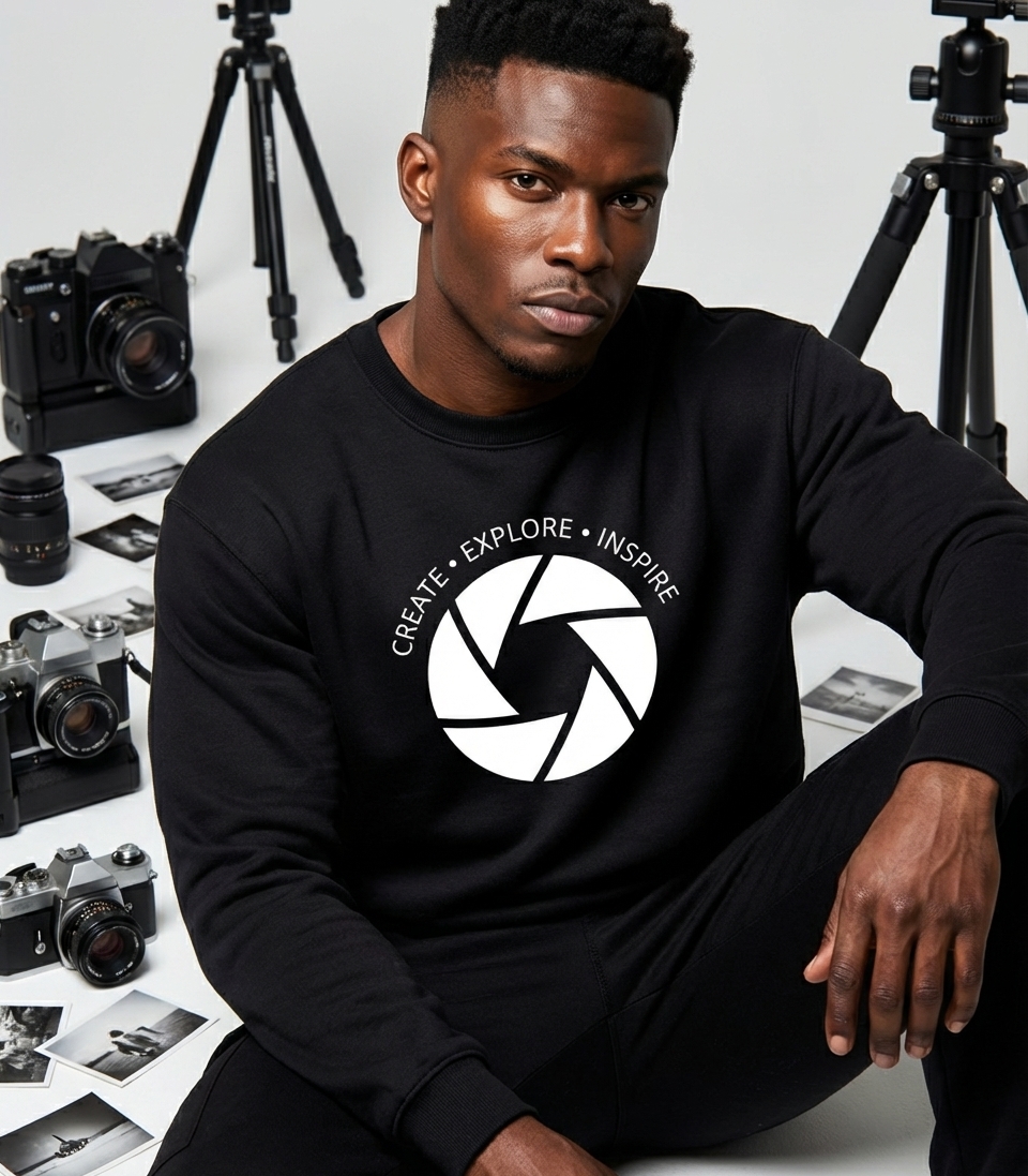 The 'Create Explore Inspire' design captures the lifestyle of passionate photographers who spend their days capturing moments, discovering new perspectives, and sharing their unique vision.