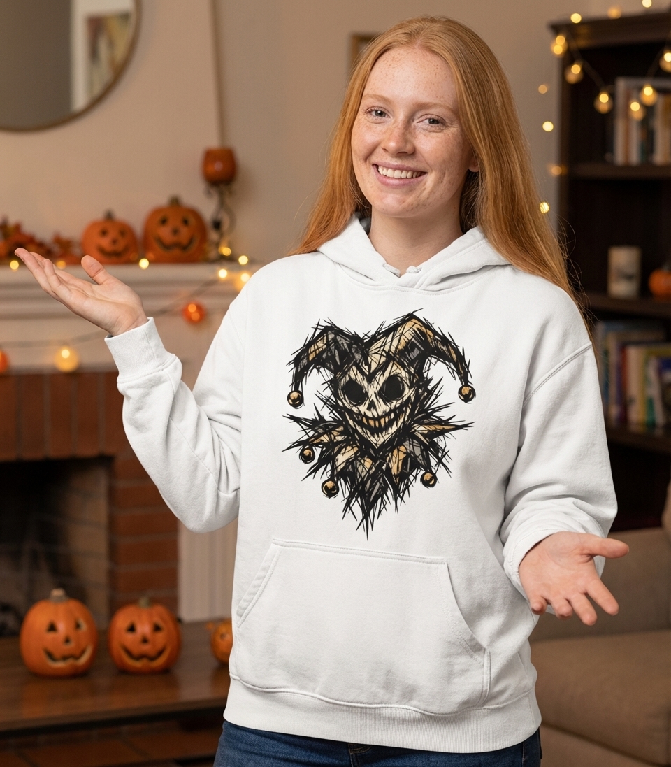 This striking jester skull artwork captures the enigmatic and dark allure for those who appreciate a unique blend of horror and classic foolery.