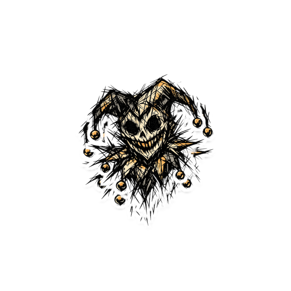 This artwork features a menacing jester skull rendered in a stark, sketchy style. The dark eyes and wide, jagged smile create an eerie and mischievous expression, reflecting a blend of humor and horror. The jester hat, adorned with bells, adds a touch of classic foolery to the macabre design.