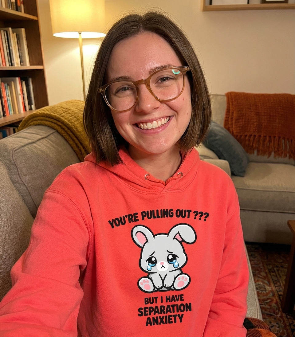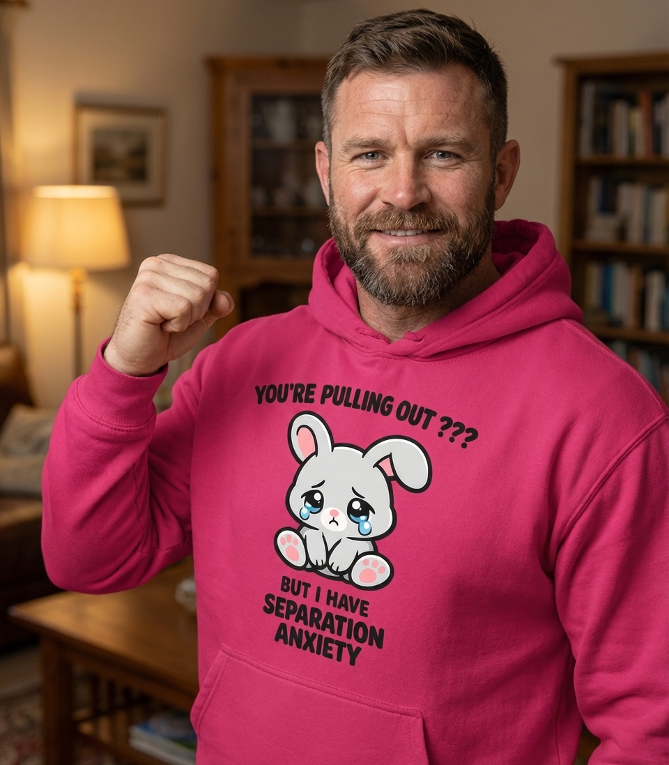 The phrase "You're pulling out???" uses a deliberate double entendre, playing on the literal act of someone leaving and the sexual implication of "pulling out." Combined with "But I have separation anxiety," the design humorously portrays a deep attachment and a reluctance for departure, whether physical or relational, with an edgy, adult twist. It's a relatable sentiment delivered with a dose of dark wit.