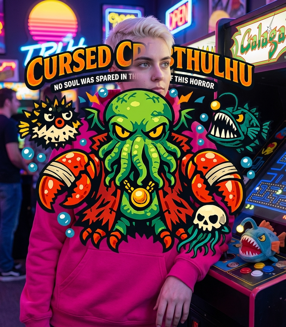 This unique graphic features a vibrant, cartoonish rendition of Crabthulhu, a terrifying yet strangely charming deep-sea entity. Surrounded by equally quirky marine life like an angry pufferfish, a menacing anglerfish, and a skull-headed jellyfish, the design perfectly blends monster horror with playful artistry.