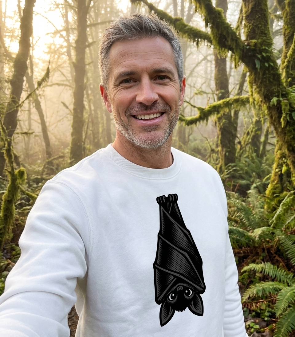 While there isn't a specific phrase on this design, the artwork embodies the charming and often misunderstood nature of bats. It playfully represents these nocturnal creatures in a friendly, endearing way.