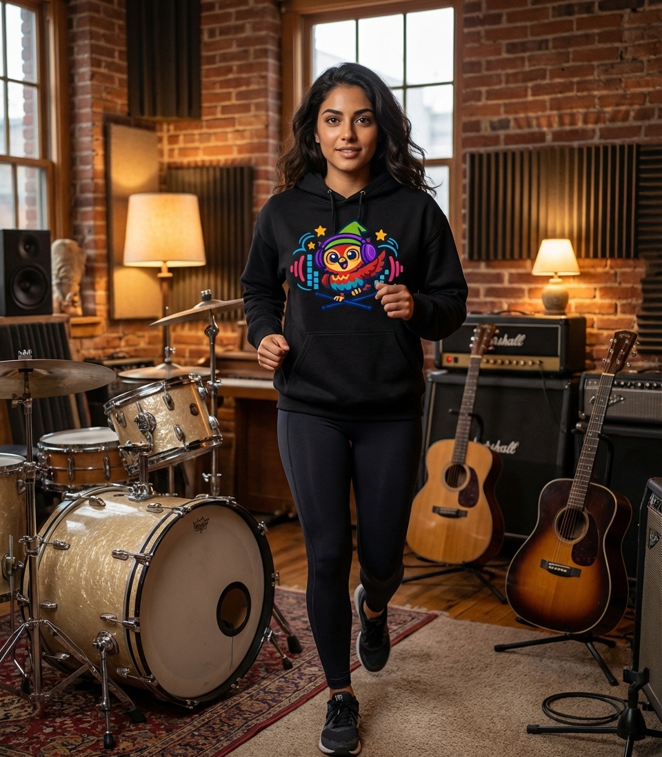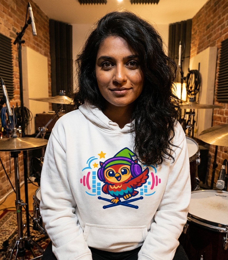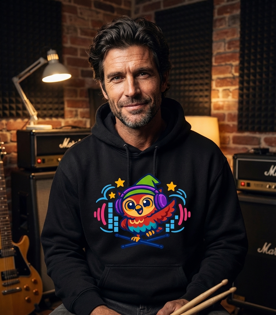 Yes! Check the style selector above to see all available options including hoodies and sweatshirts for the Cute Owl Drummer graphic.