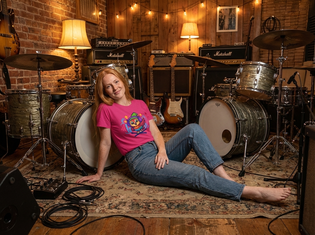 While there isn't a specific textual phrase, the visual message conveys a deep love for music and drumming through a cute, unexpected character. It symbolizes embracing one's passion for rhythm and sound, regardless of who or what you are, with a lighthearted and enthusiastic spirit.