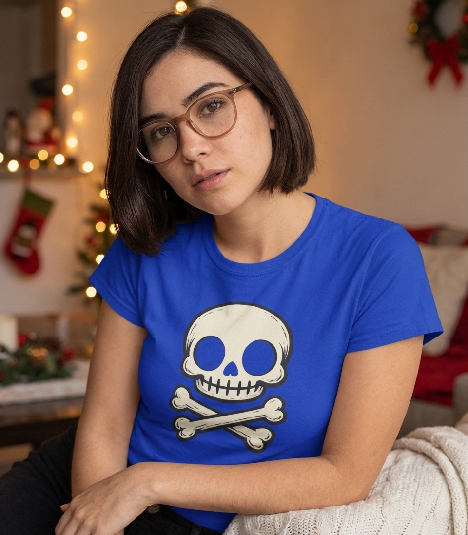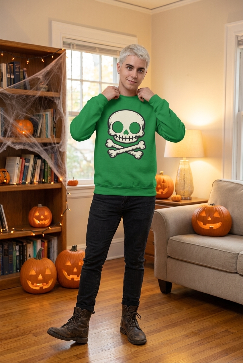 The skull and crossbones is a universally recognized symbol, often associated with pirates and danger, but also a popular emblem for Halloween and gothic aesthetics. In this context, it embodies a fun, lighthearted take on a traditionally ominous image.