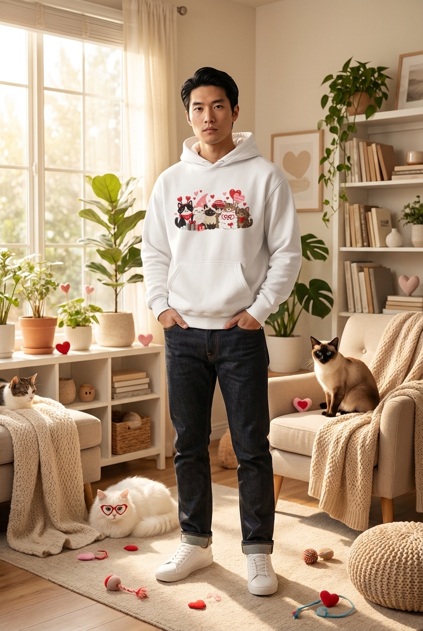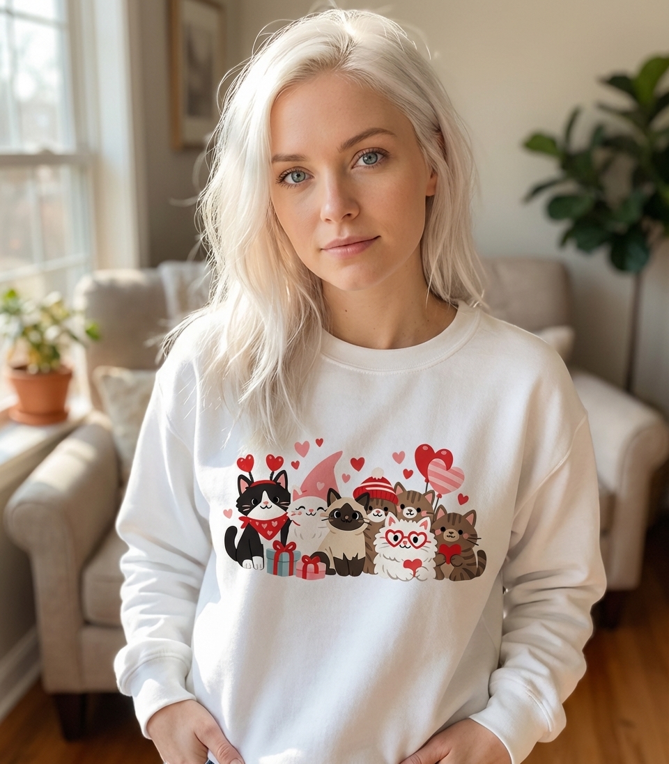 This design captures the heartwarming spirit of cat lovers celebrating Valentine's Day with their adorable feline companions.