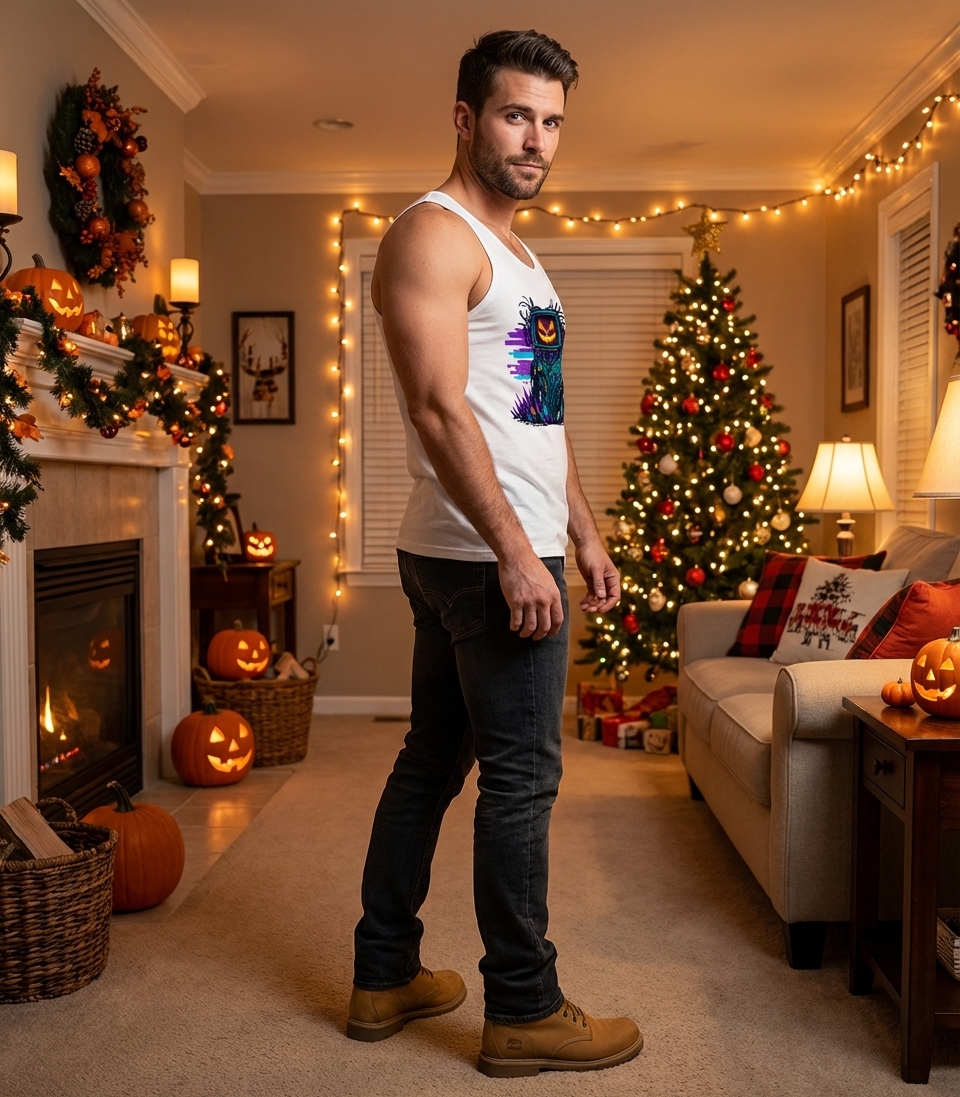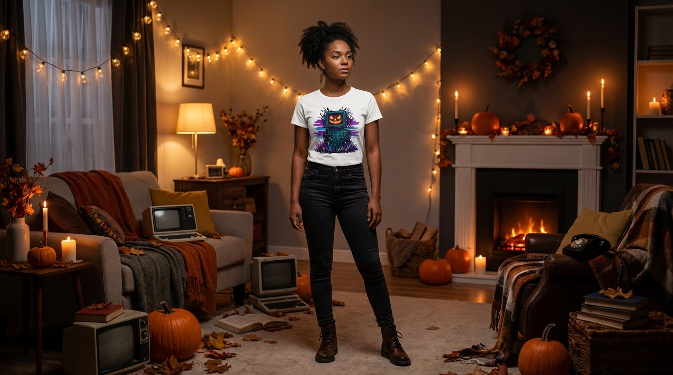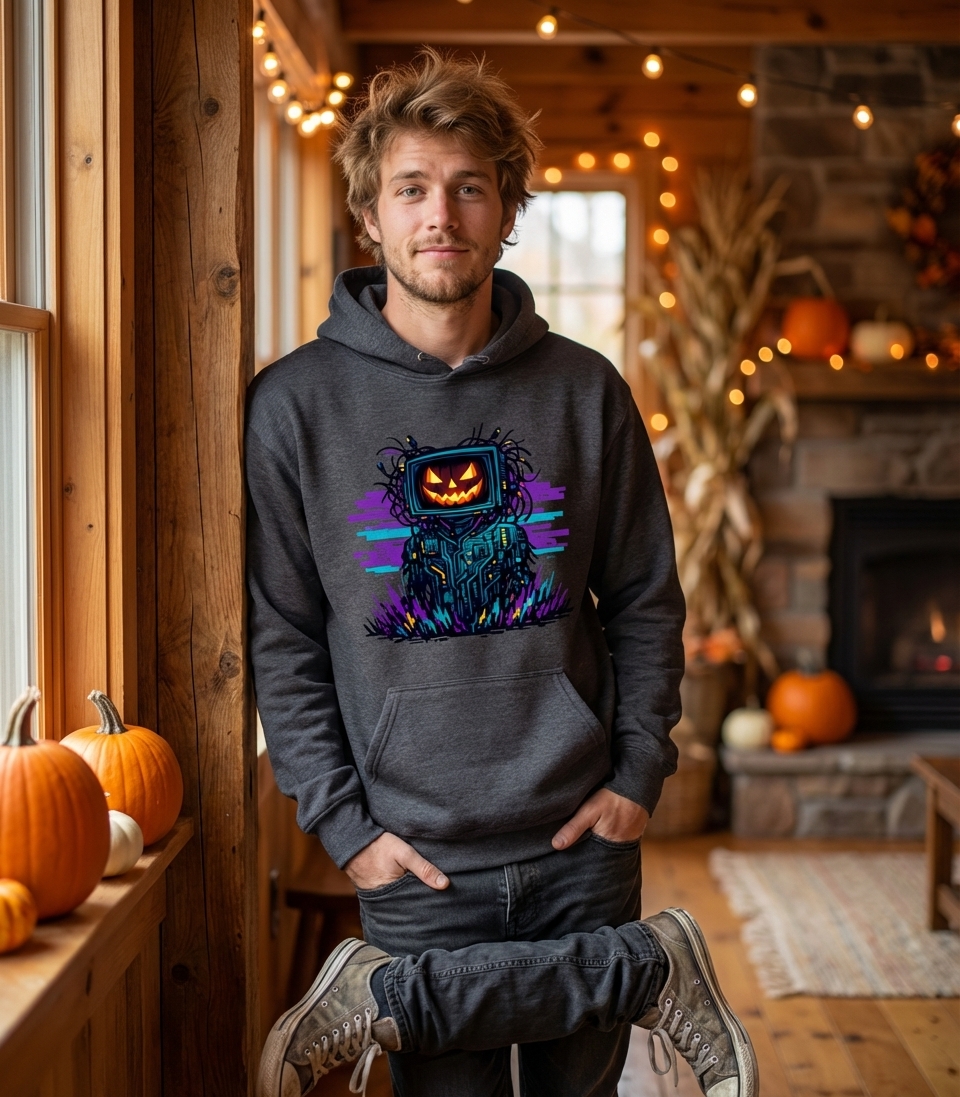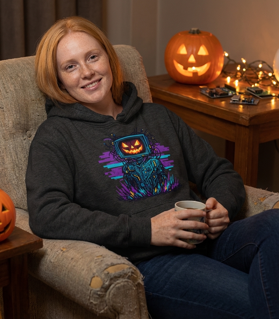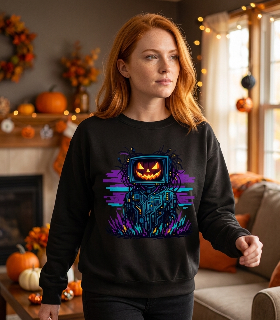 This unique design captures the thrilling lifestyle of tech-savvy Halloween enthusiasts who love gaming, retro aesthetics, and spooky-futuristic vibes.
