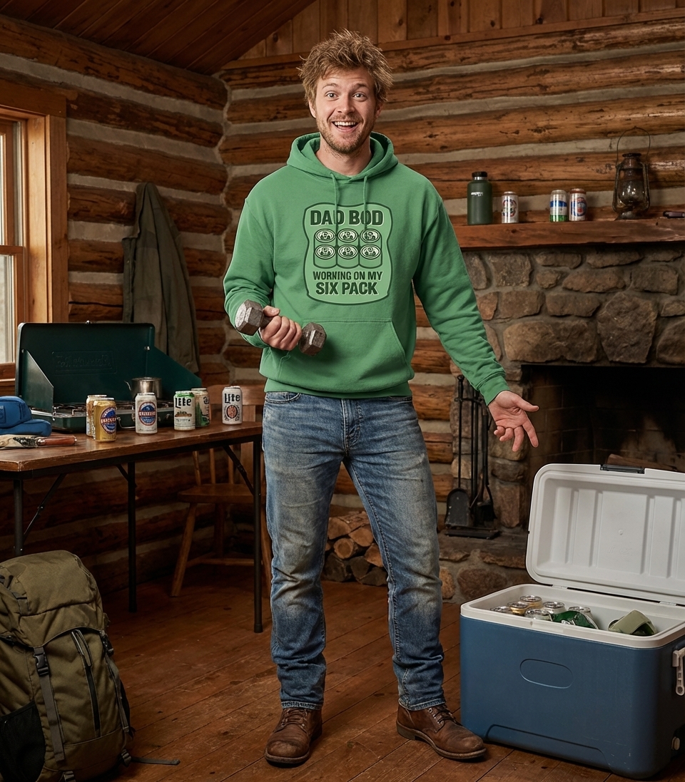 The "Dad Bod Working on My Six Pack" phrase captures the lifestyle of fun-loving dads who enjoy a relaxed physique, good humor, and a cold beverage.