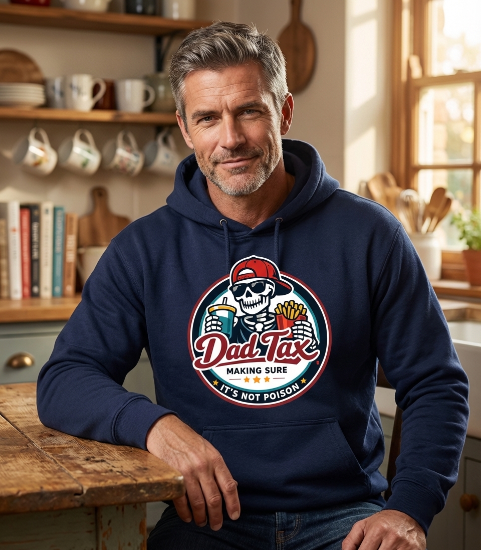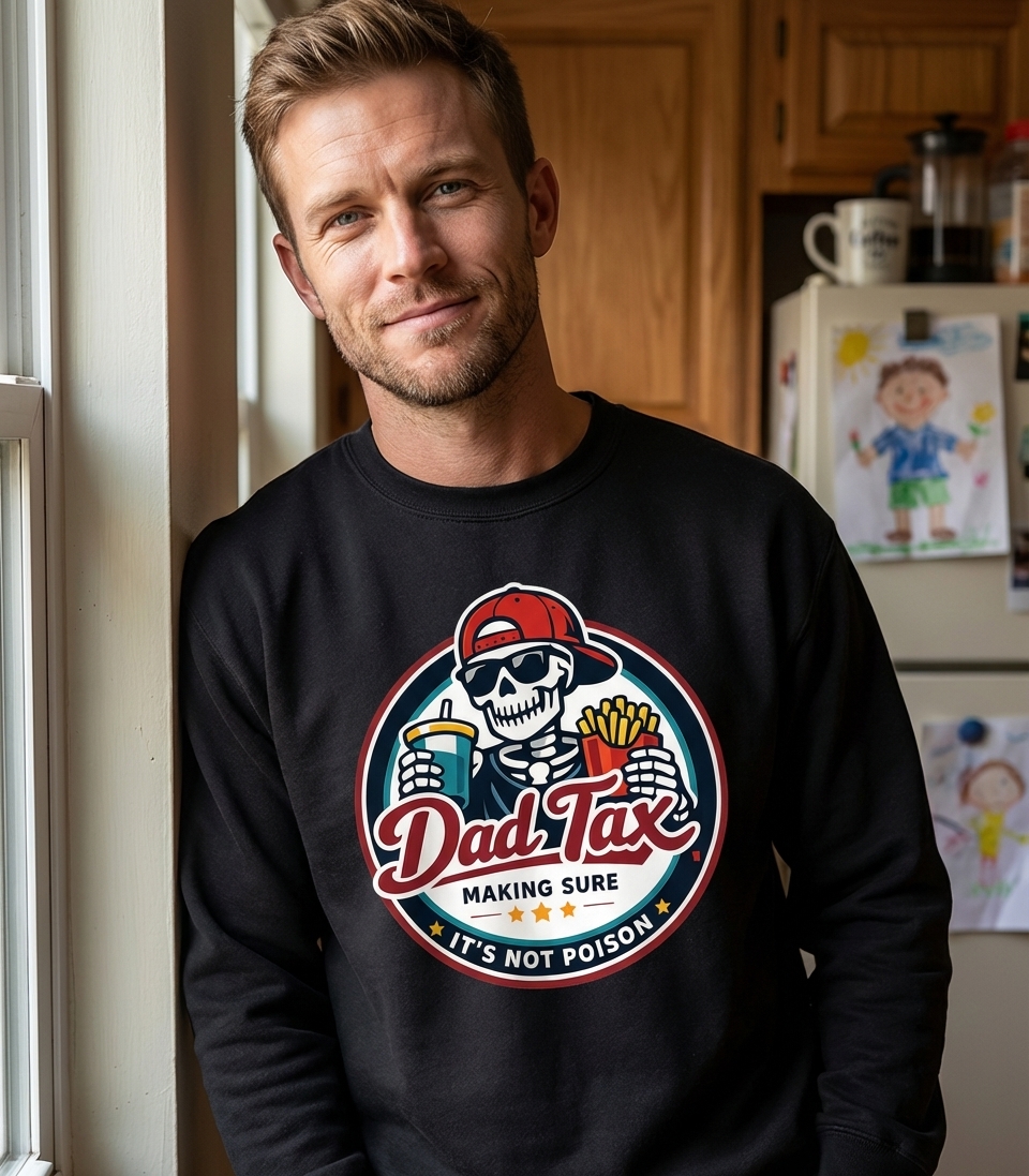 The phrase 'Dad Tax' refers to the humorous tradition where fathers 'inspect' or 'sample' their children's snacks, treats, or meals. It's a playful way for dads to get a bite of whatever their kids are eating, often under the guise of making sure it's safe or tastes good. The addition 'making sure it's not poison' further enhances this fun, sarcastic take on paternal 'food inspection'.