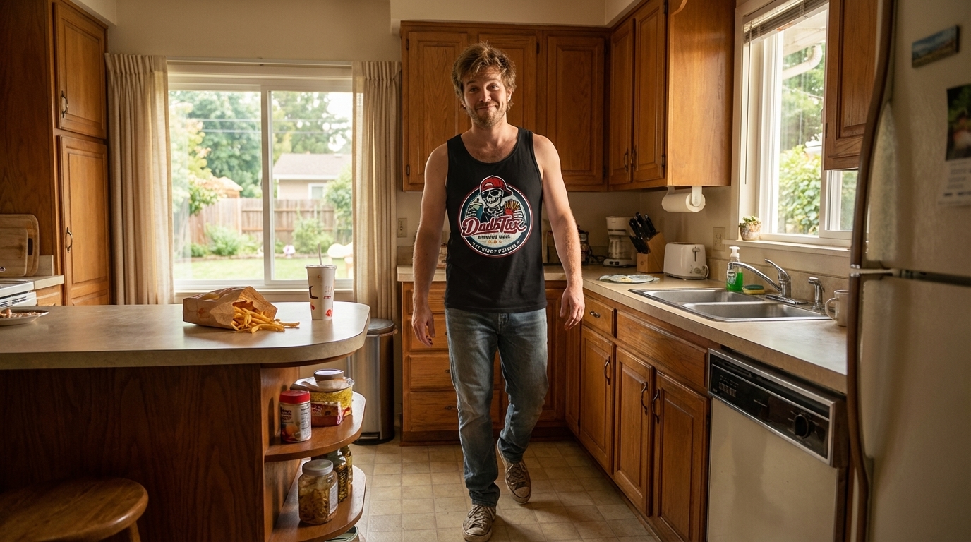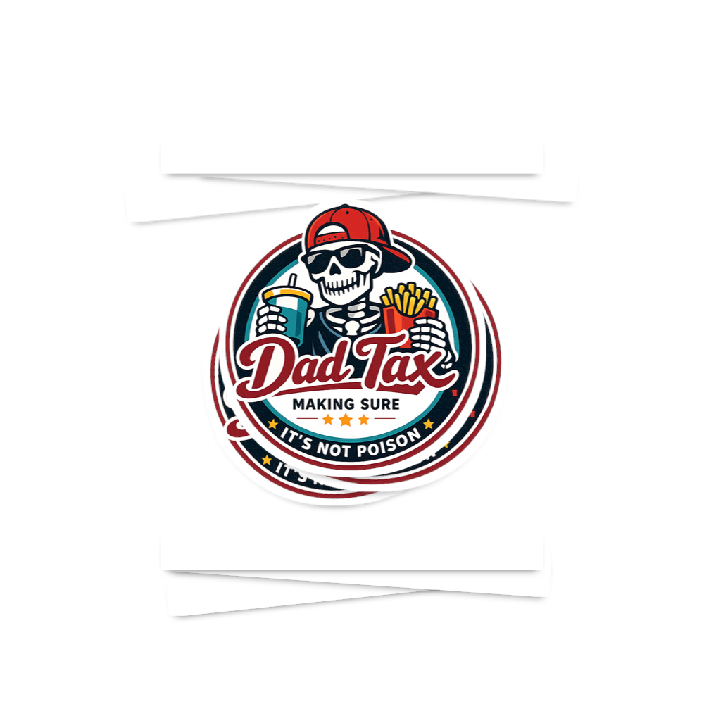 The 'Dad Tax' phrase captures the lifestyle of playful fathers who enjoy a 'taste test' of their kids' snacks, ensuring quality control.