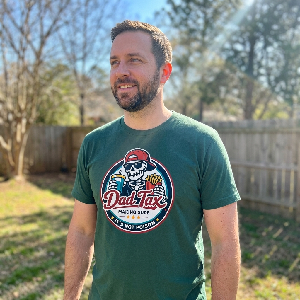 Okay, this tee is awesome. The 'dad tax' skeleton design cracks me up every time, and it's actually really comfortable and soft, not one of those scratchy shirts. perfect for chilling or making the kids groan.