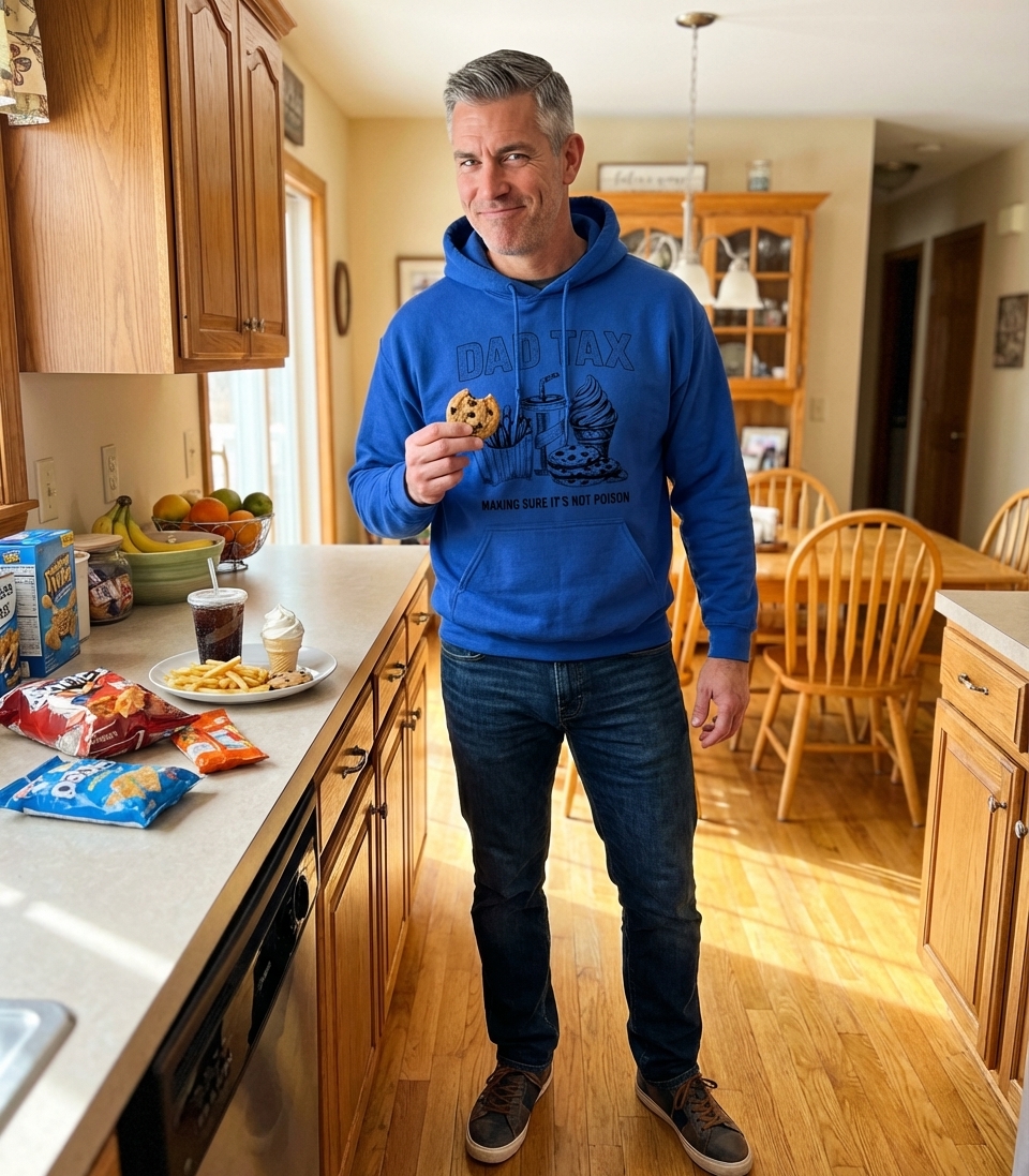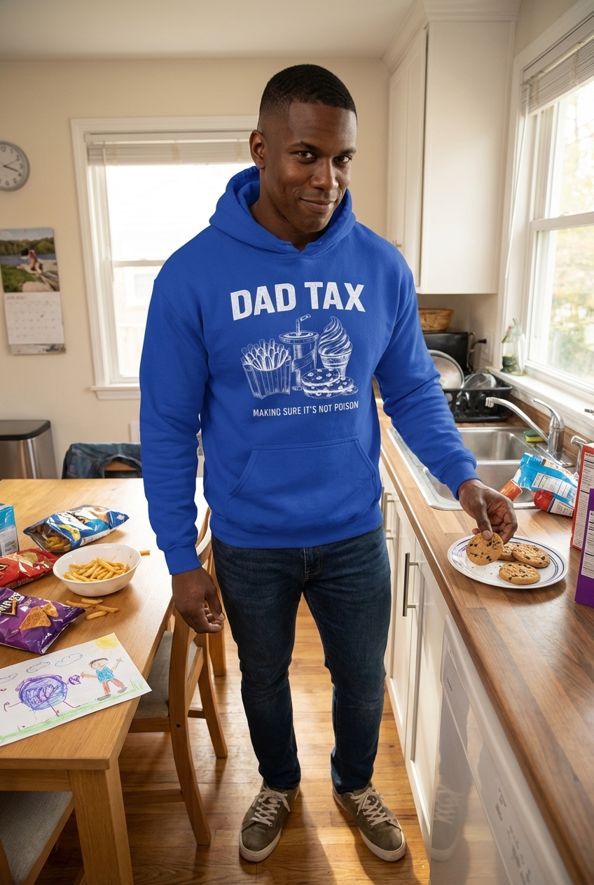 The 'Dad Tax' phrase captures the playful lifestyle of dads who enjoy a humorous bite of their kids' favorite snacks, ensuring quality control one treat at a time.
