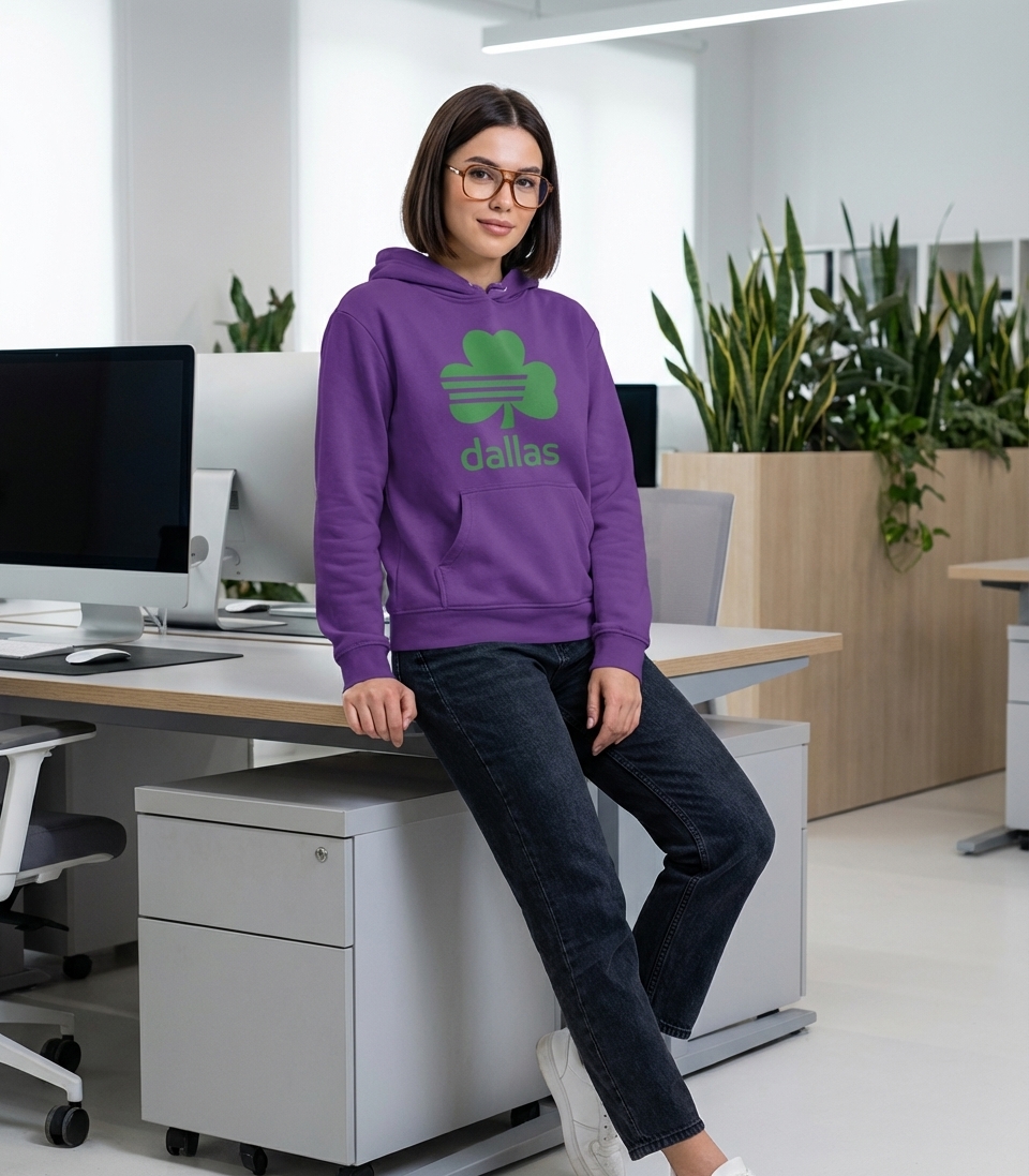 This unique graphic blends local Dallas pride with classic Irish symbolism. It features a prominent green shamrock, an iconic symbol of good luck and Irish heritage, creatively integrated with a stylized three-stripe pattern.