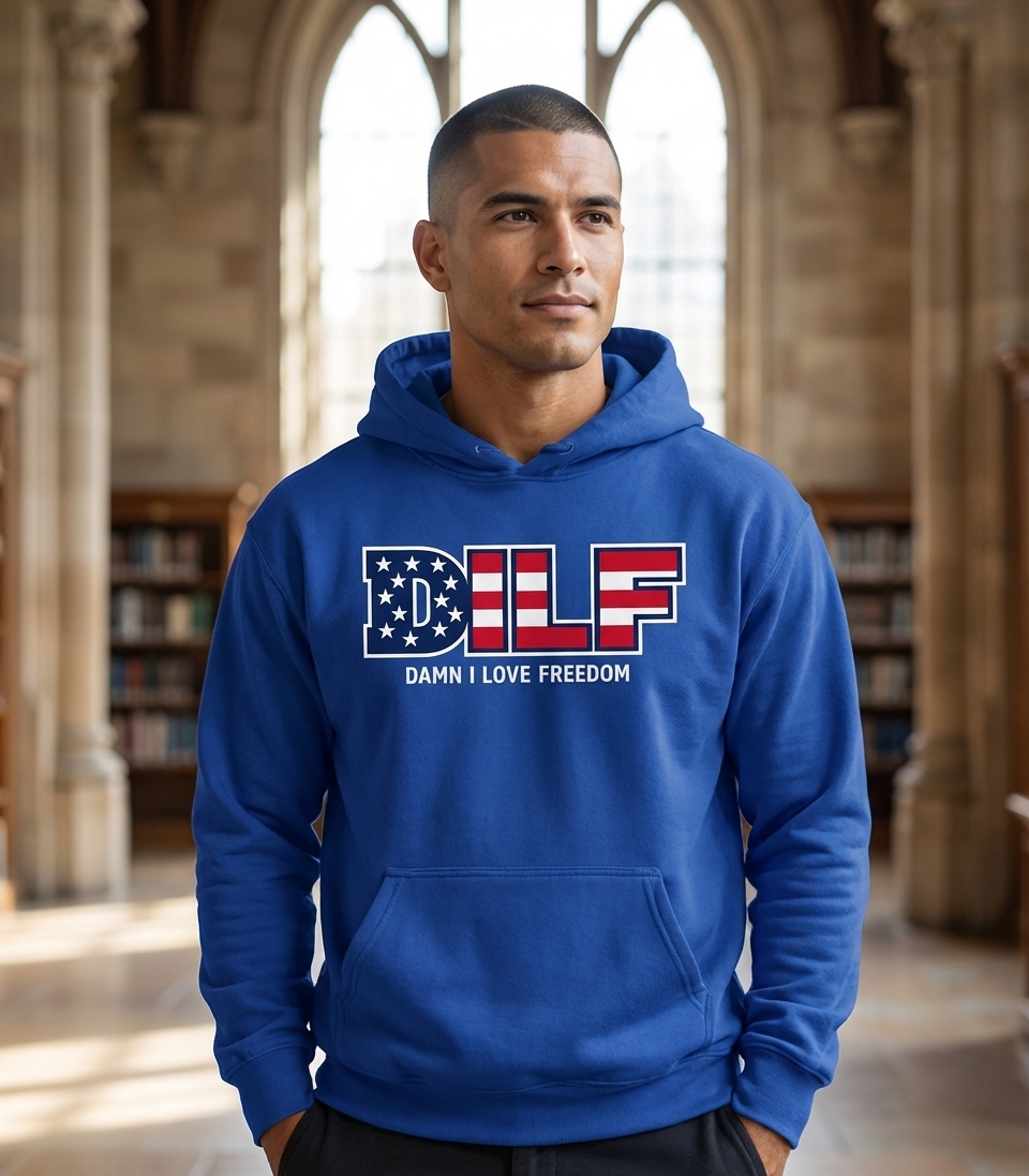 This graphic tee design boldly features the acronym "DILF" artfully rendered with the iconic red, white, and blue pattern of the American flag. Below, the phrase "Damn I Love Freedom" clarifies the clever and patriotic reinterpretation of the initialism.