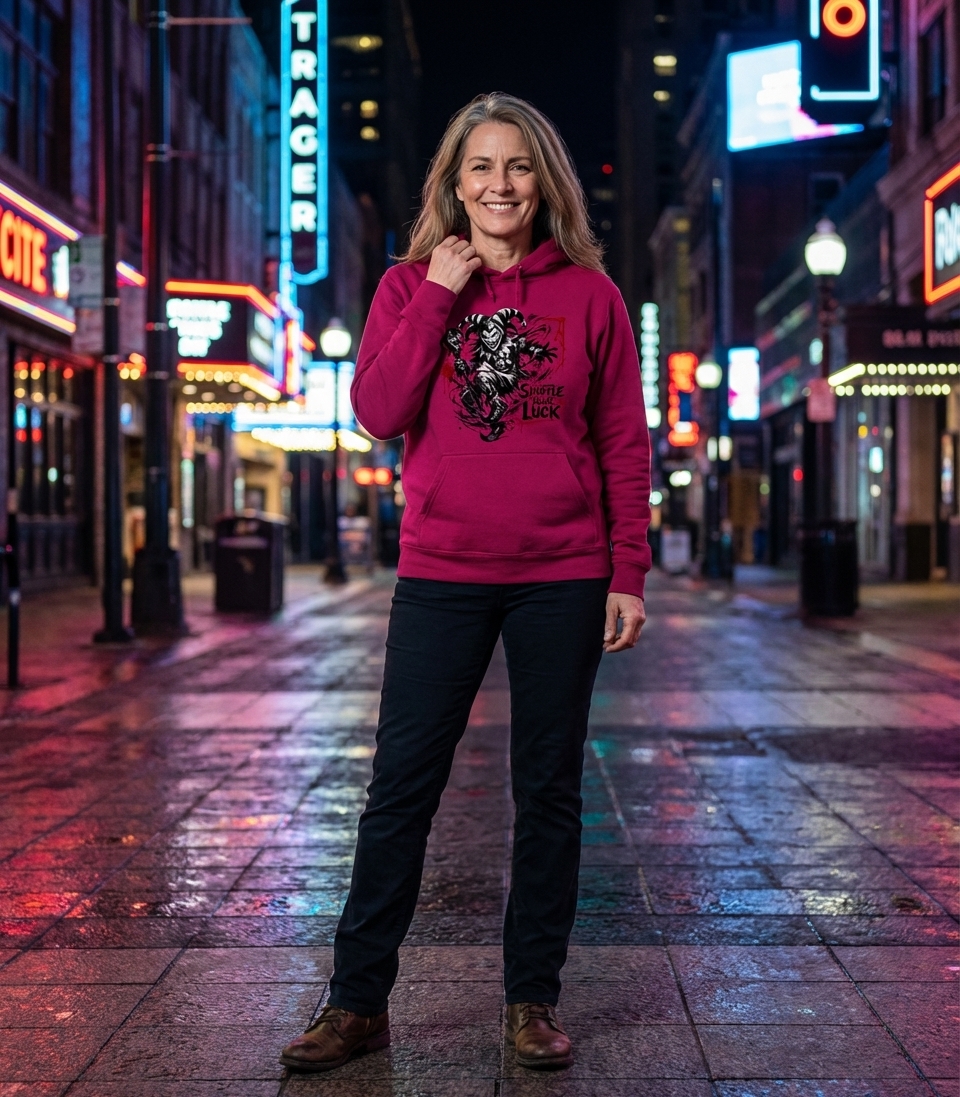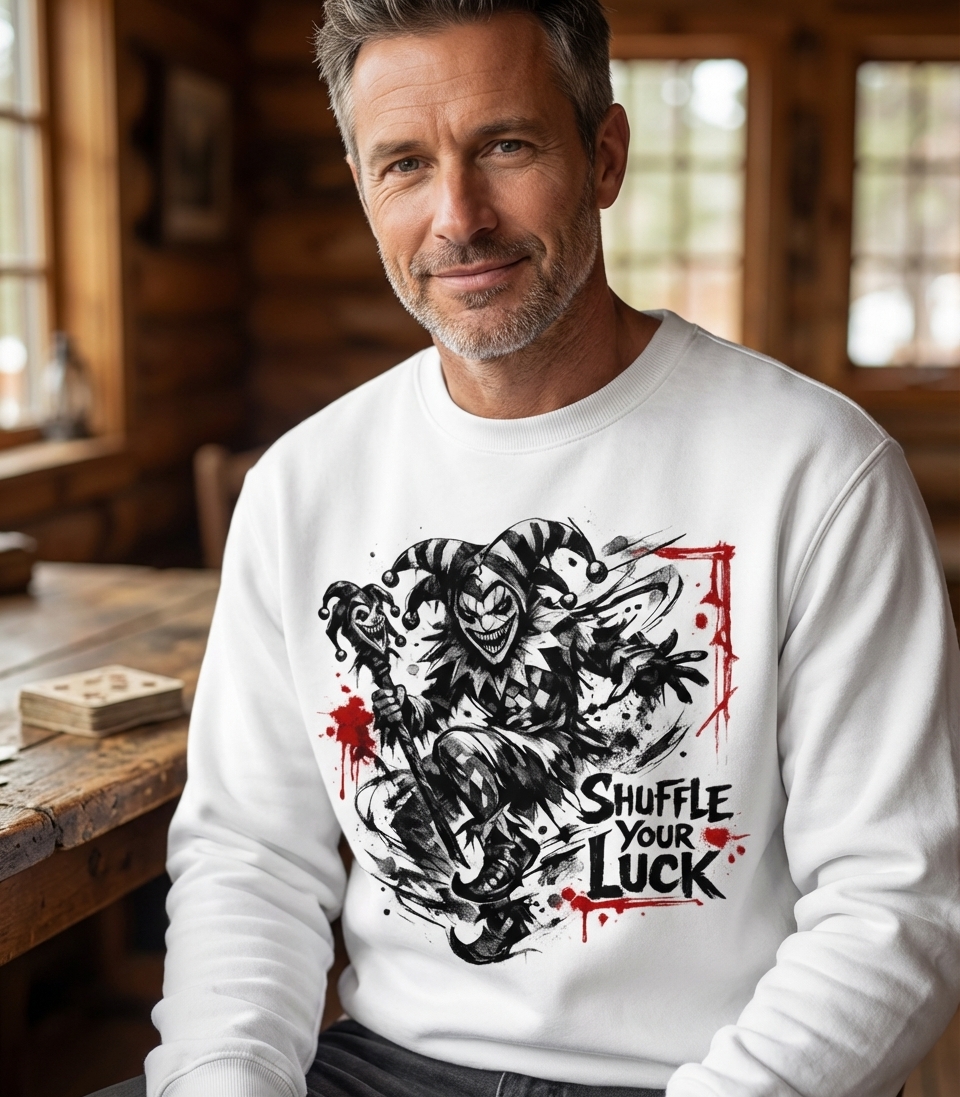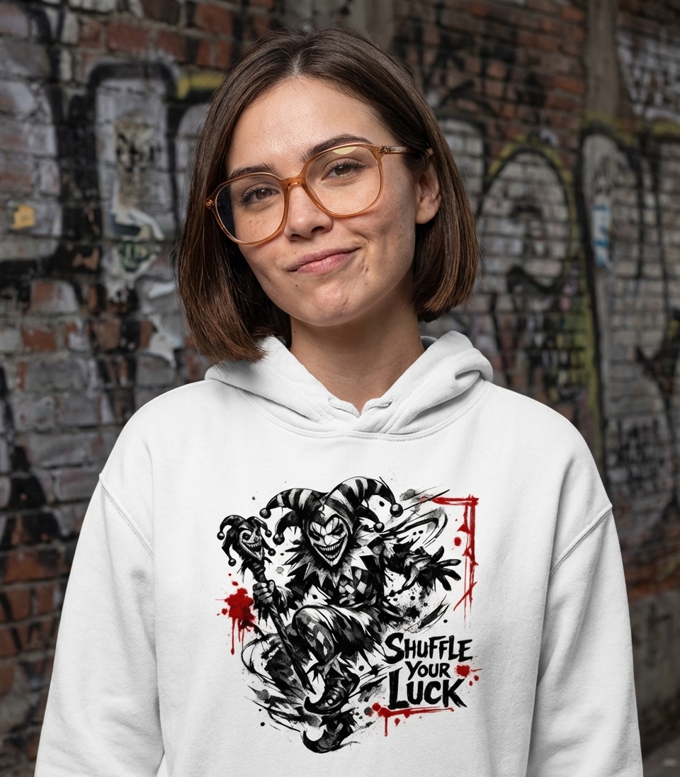 The "Shuffle Your Luck" phrase captures the cynical outlook of those who embrace chaotic chance, dark humor, and unpredictable outcomes.