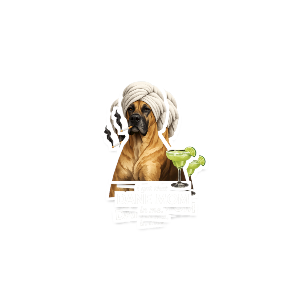 This unique design features a cool Great Dane rocking a towel wrap, a lit cigarette, and a refreshing margarita. It embodies a relaxed yet sassy attitude, perfect for those who adore their giant dog breeds with a sense of humor.