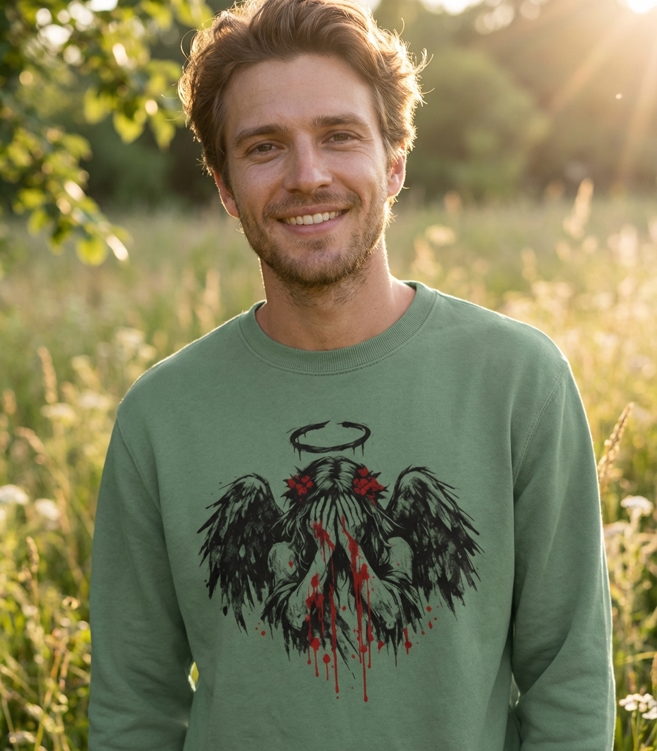 This design speaks to the melancholic beauty found in adversity and the profound emotions that define the human, and perhaps divine, experience.