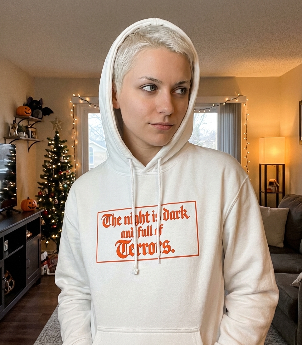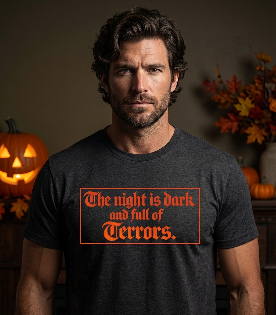 The phrase "The night is dark and full of Terrors." originates from popular fantasy culture, representing a world where danger and unknown threats lurk in the shadows. It speaks to themes of fear, survival, and the hidden evils that emerge when daylight fades.