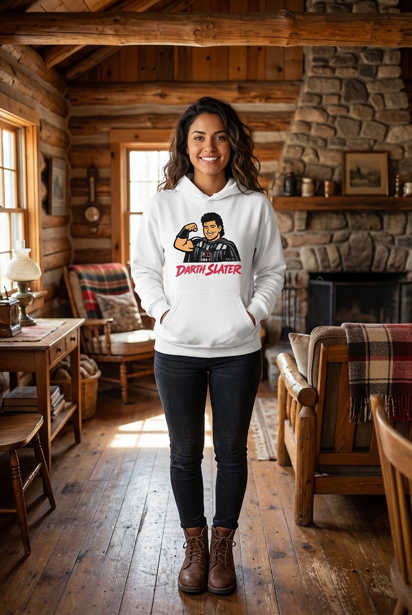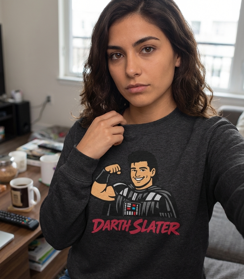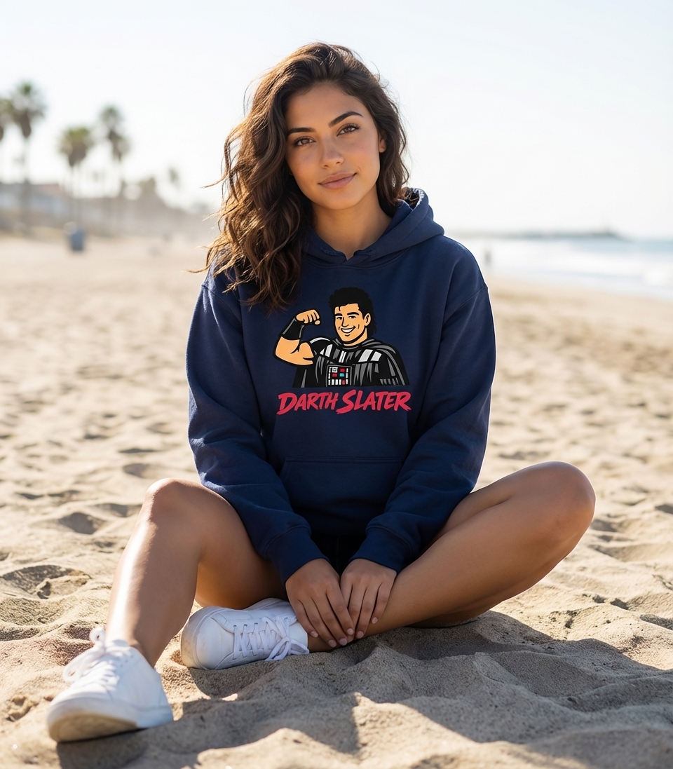The phrase 'Darth Slater' is a direct pun, blending 'Darth Vader' from the iconic Star Wars universe with 'A.C. Slater,' a popular character from the classic television sitcom 'Saved by the Bell.' It playfully suggests a villainous version of the wholesome, muscle-bound character.