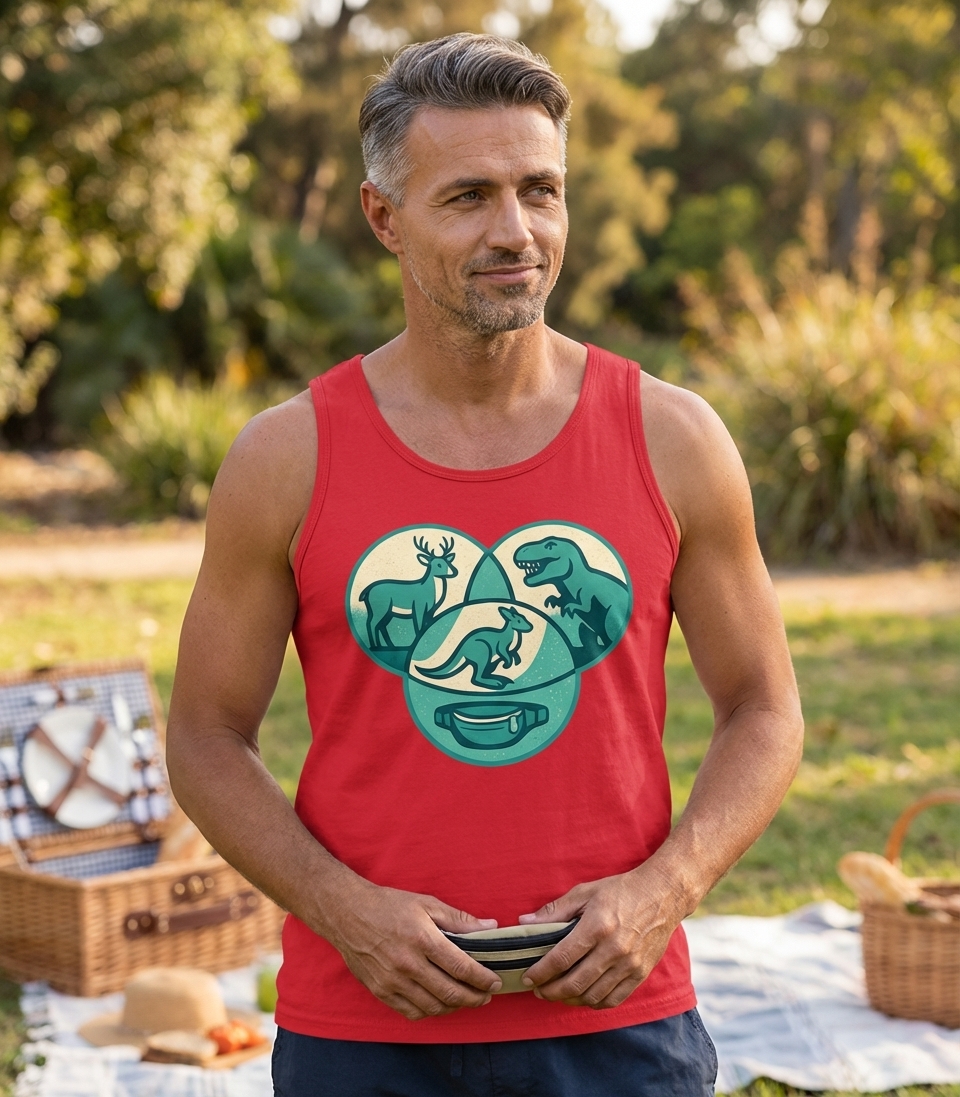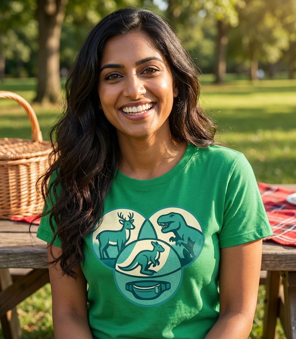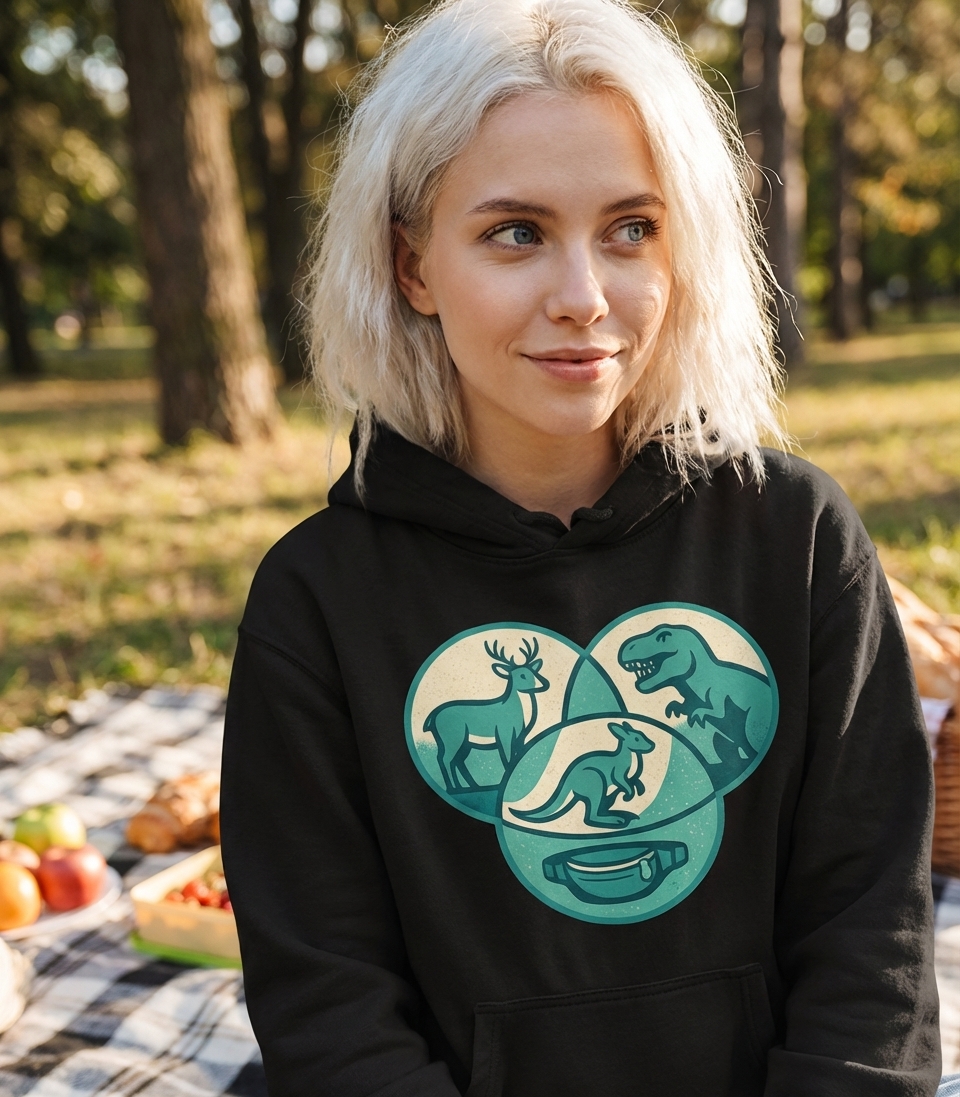 This humorous graphic features a clever Venn diagram illustrating a phonetic pun. It visually combines a deer, a T-Rex, and a kangaroo, with a fanny pack positioned in their central overlap, creating a playful riddle.