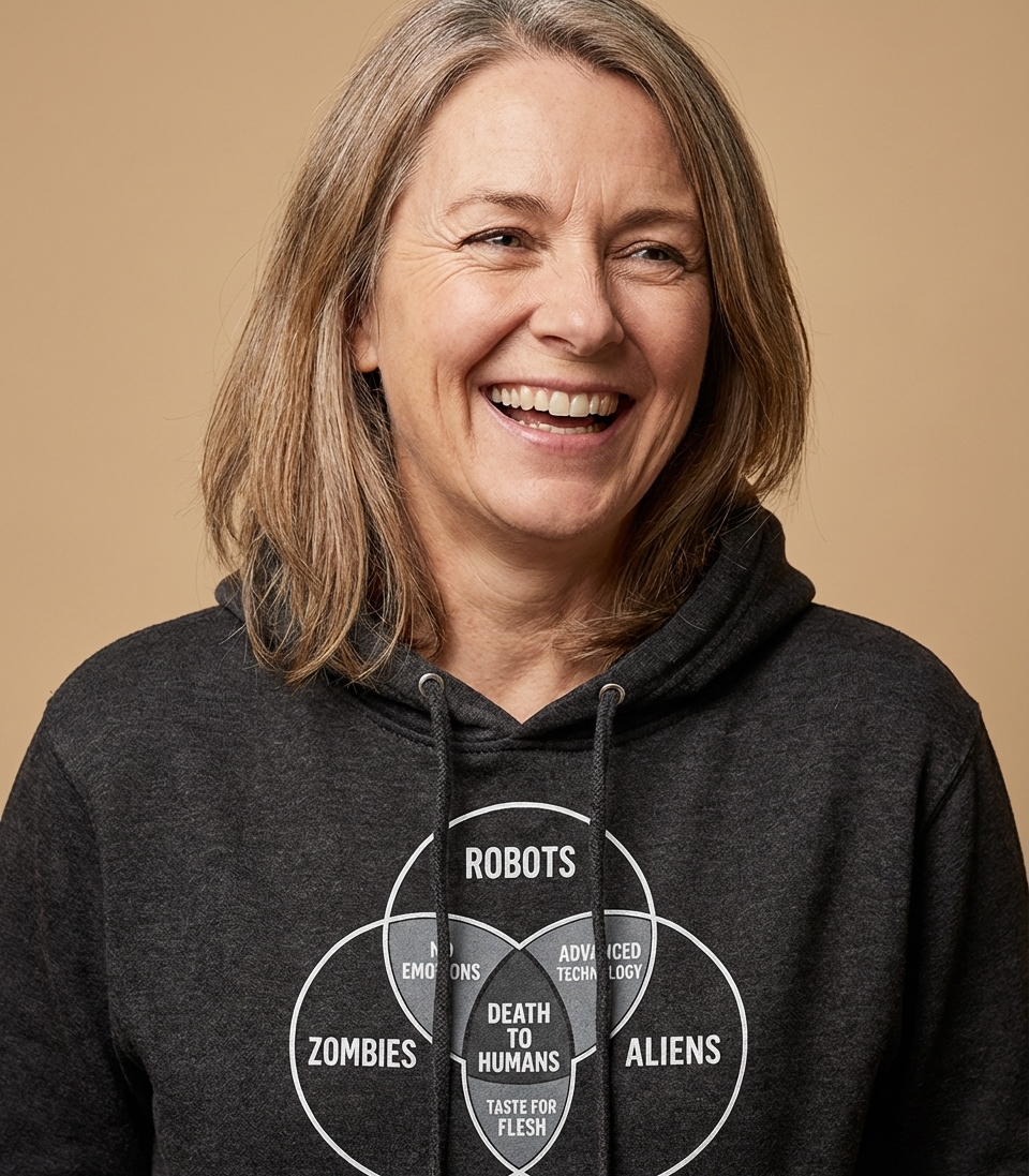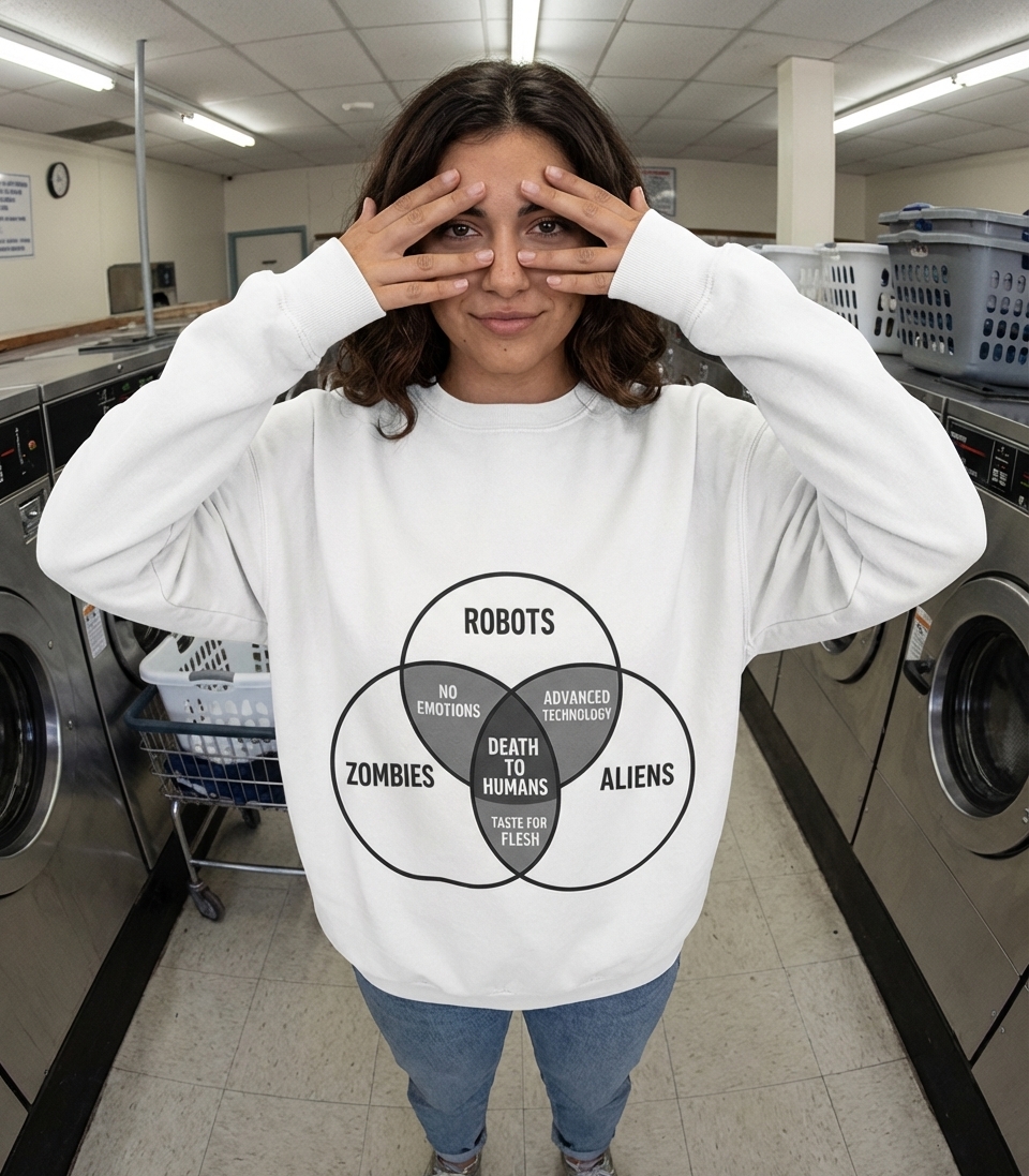 This graphic presents a satirical Venn diagram illustrating the common objective of three distinct threats: Robots, Zombies, and Aliens. Each circle represents one group, with their overlapping characteristics—"No Emotions" (Robots and Zombies), "Advanced Technology" (Robots and Aliens), and "Taste for Flesh" (Zombies and Aliens)—leading to the central, shared intersection of "Death to Humans."