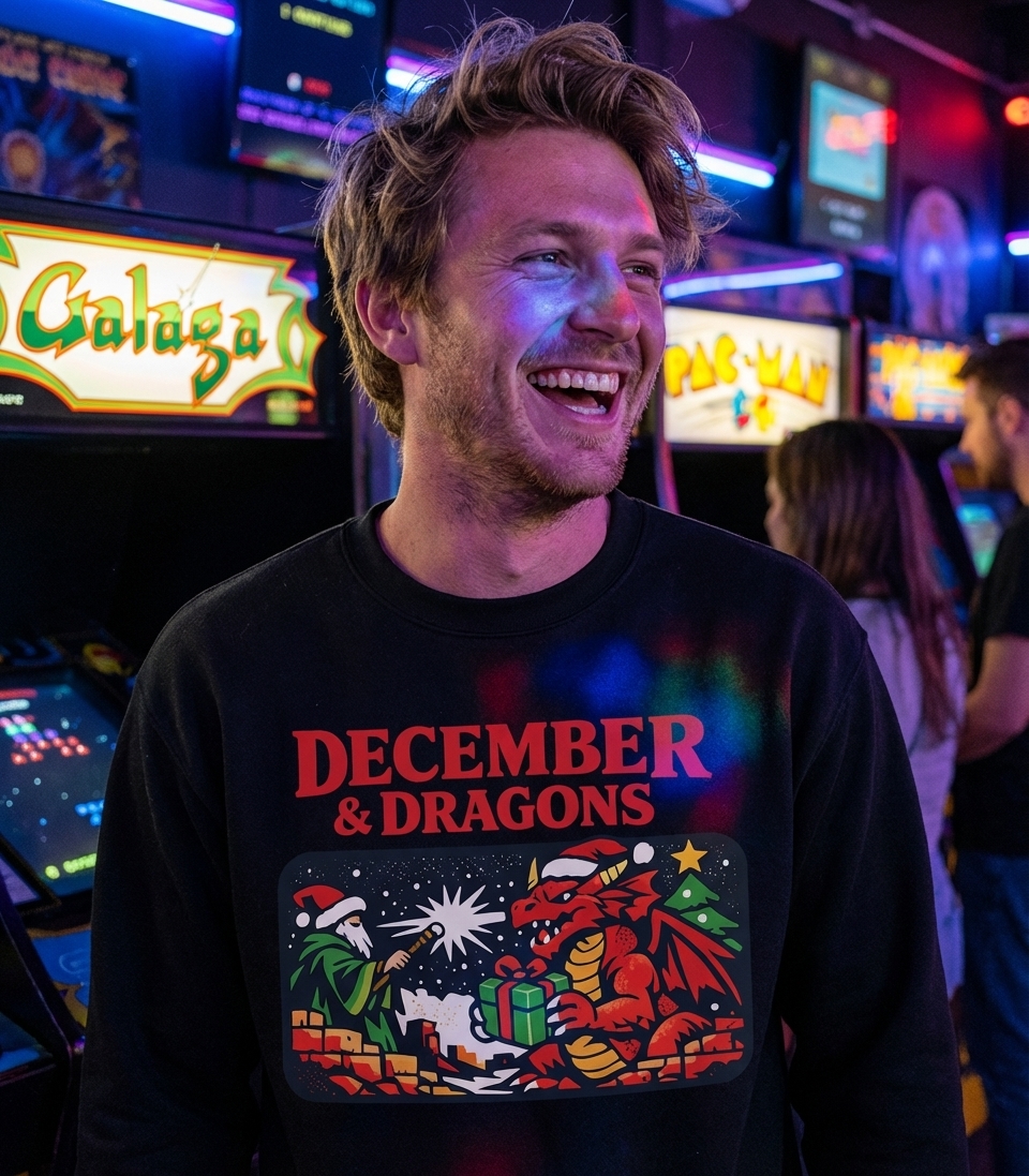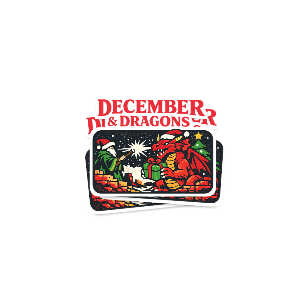 The 'December & Dragons' phrase captures the festive spirit of passionate tabletop gamers who spend their holidays questing, rolling dice, and celebrating fantasy.