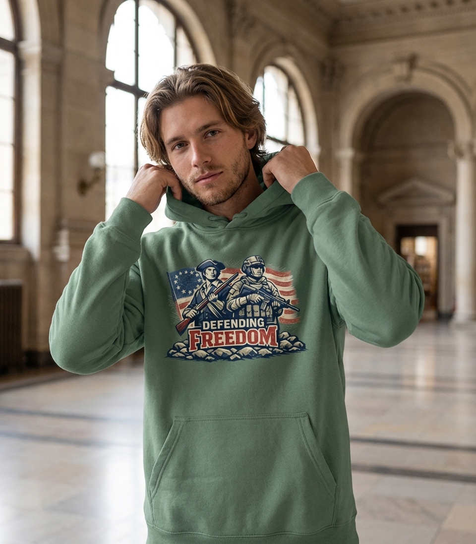 The 'Defending Freedom' design captures the enduring spirit of American patriots, from colonial times to the present day, protecting the nation's core values.