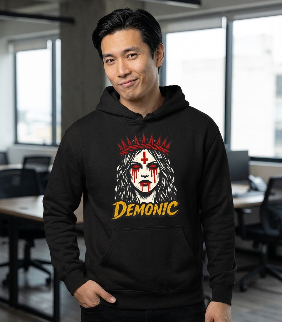 The 'Demonic' phrase captures the lifestyle of passionate metalheads and gothic enthusiasts who spend their days embracing dark aesthetics, subverting traditional symbols, and celebrating alternative counter-culture.