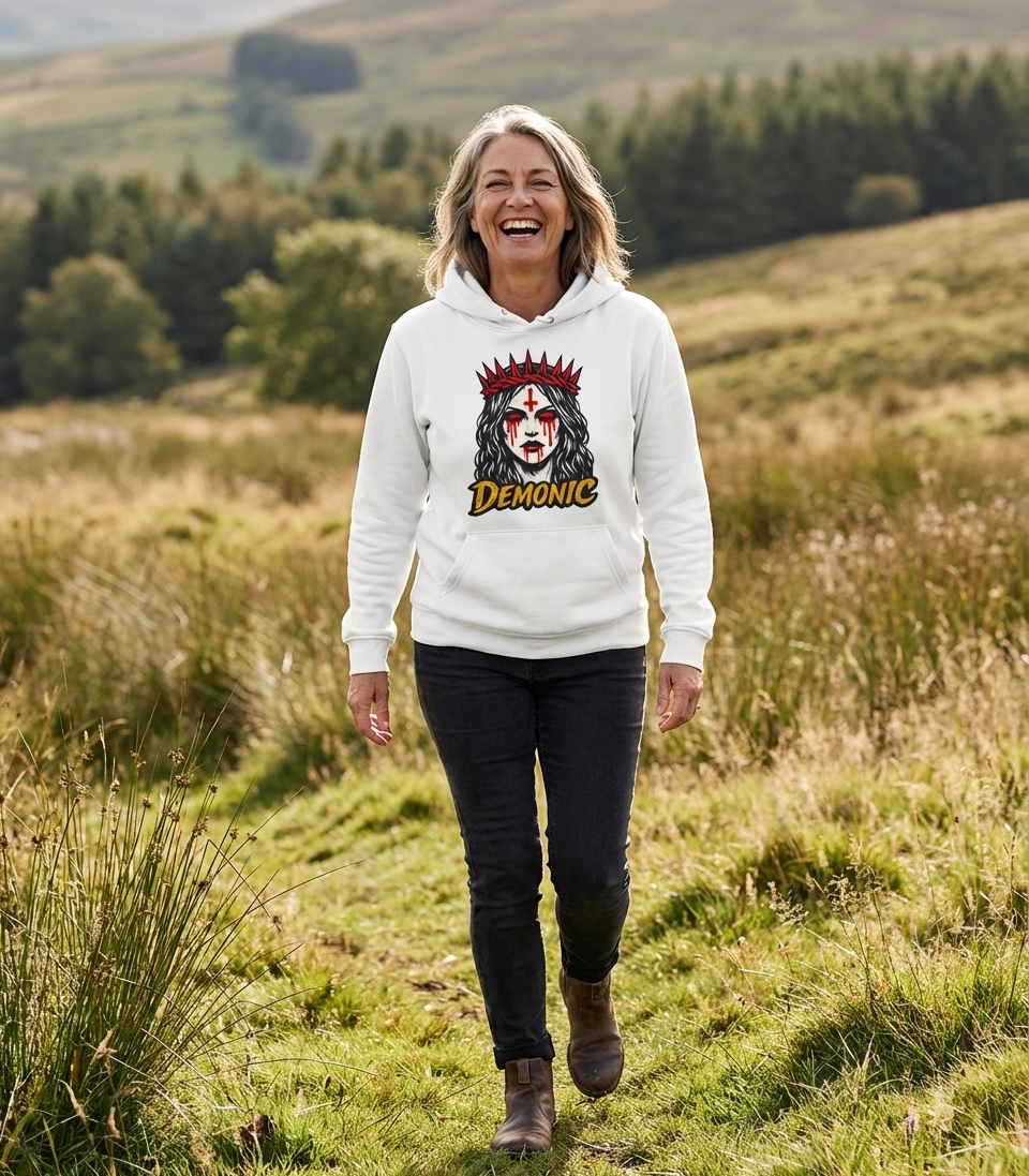 The word 'Demonic' in this context serves as a bold declaration, often associated with rebellion against conventional norms or an appreciation for horror and dark fantasy themes. It is a direct and unflinching embrace of an alternative aesthetic.
