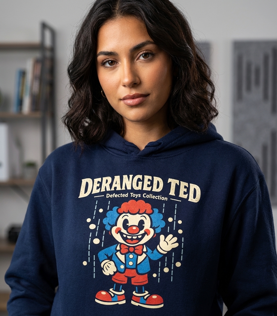 This unique graphic features "Deranged Ted," a vintage-style clown from the "Defected Toys Collection." The artwork combines a cheerful, retro cartoon aesthetic with a subtle hint of the sinister, creating a memorable and intriguing character.