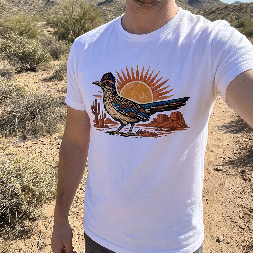 The desert roadrunner design captures the lifestyle of those who love exploring arid landscapes, admiring unique wildlife, and embracing the adventurous spirit of the American Southwest.