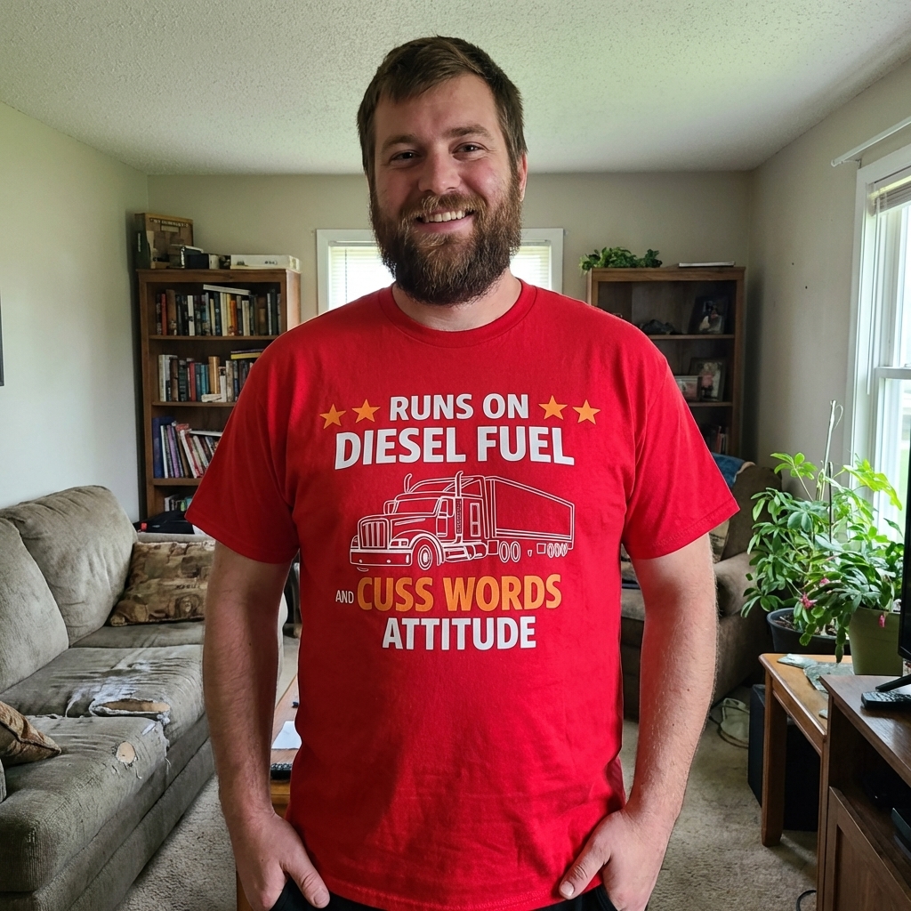 The phrase "Runs on Diesel Fuel and Cuss Words Attitude" is a witty declaration of a truck driver's core necessities. "Diesel Fuel" refers to the literal power source for their big rig, while "Cuss Words Attitude" metaphorically represents the tough, direct, and sometimes salty demeanor required to navigate the challenges of the road and life.