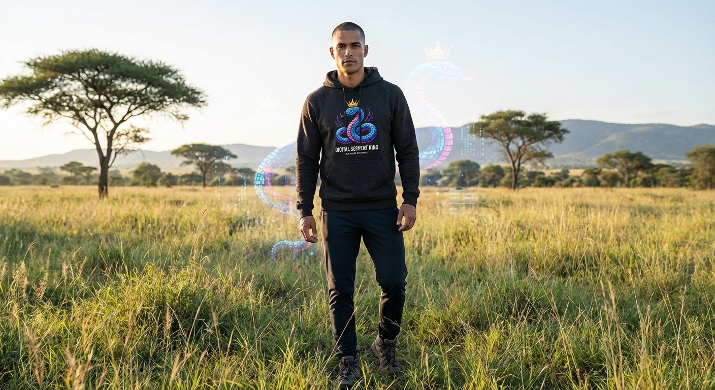 The crowned snake symbolizes wisdom, power, and transformation, elevated with a regal touch. The digital, pixelated pattern and accompanying bars evoke themes of technology, gaming, and electronic music. It represents a fusion of ancient symbolism with contemporary digital culture, signifying a mastery within the modern world.