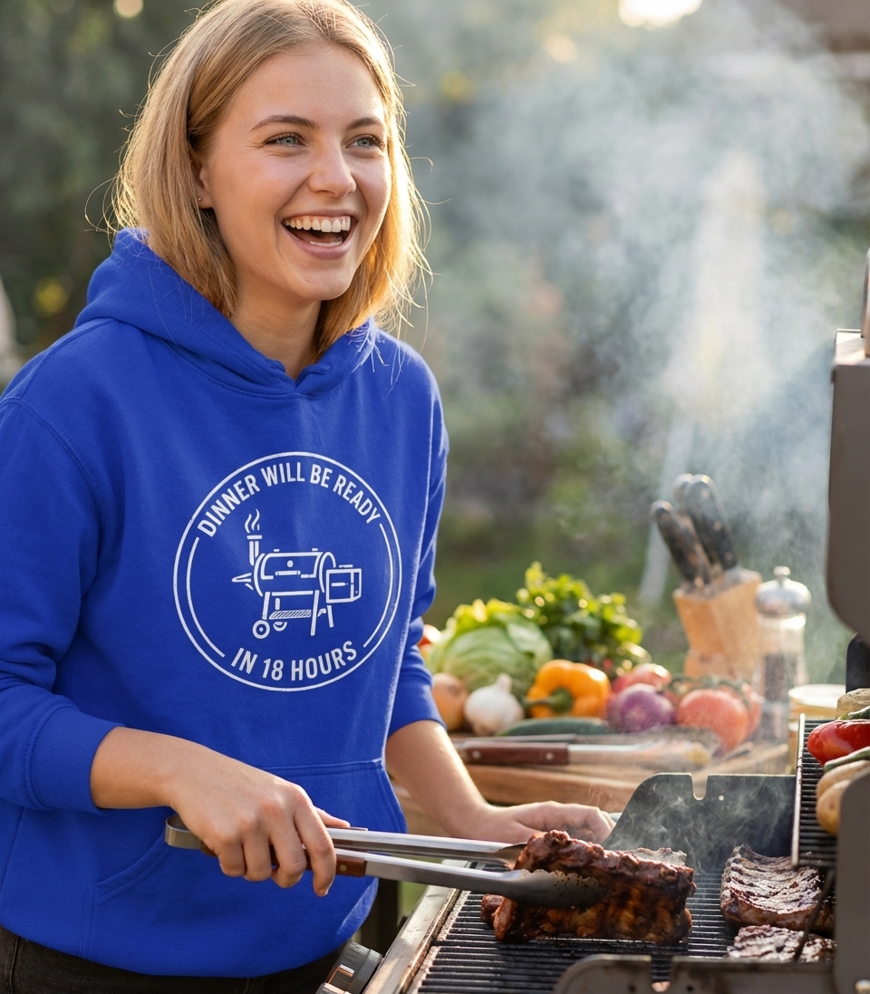 The "Dinner Will Be Ready in 18 Hours" phrase captures the lifestyle of passionate BBQ enthusiasts who spend their days tending to their smoker, perfecting their recipes, and anticipating a delicious meal.
