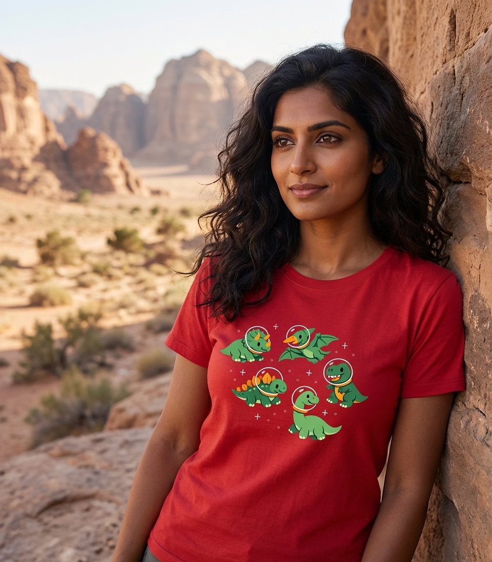 The "Dino Astronauts" design captures the playful spirit of those who imagine prehistoric creatures embarking on cosmic journeys, discovering new worlds, and making friends across the galaxy.