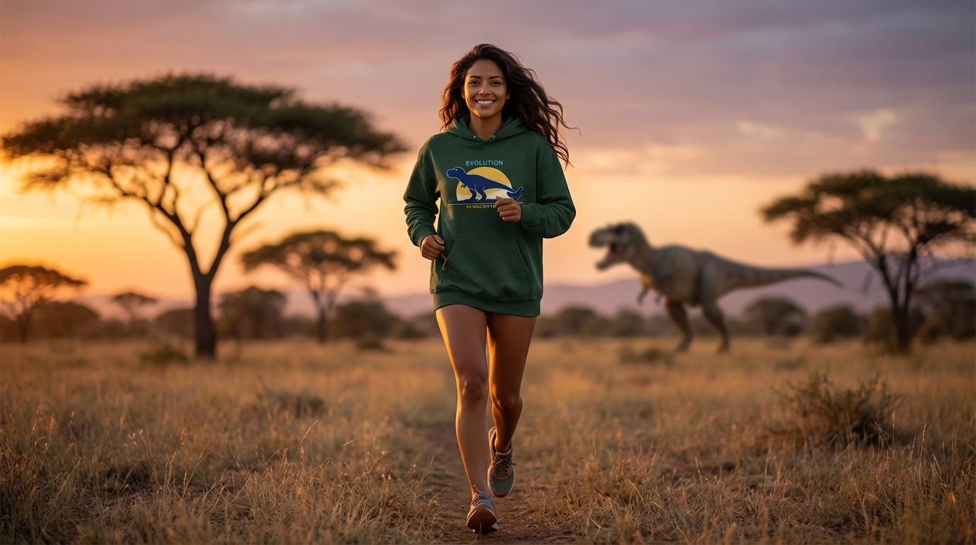 This striking graphic showcases a bold T-Rex silhouette with a small chicken emerging from its tail, set against a vibrant sunset. The illustration cleverly depicts the concept of evolution over millions of years.