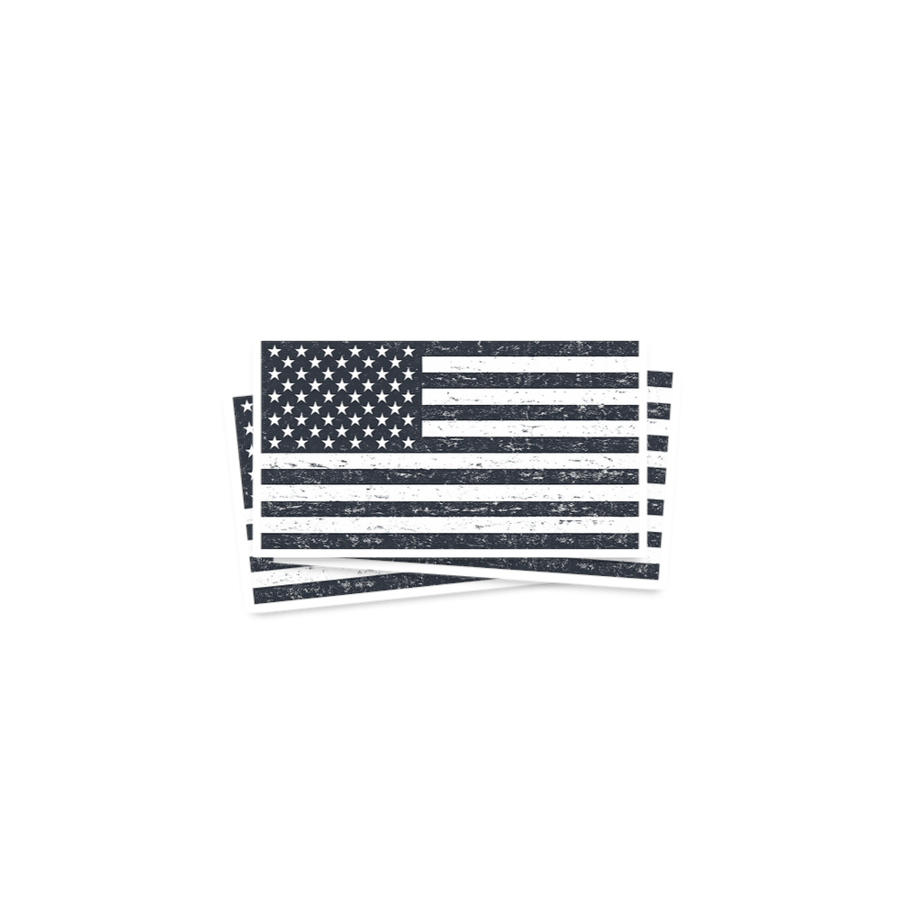The design features a classic American flag, rendered in a dark grey (or black) and white color palette. The artistic style is distinctively distressed and grunge, creating a worn, textured appearance across the stars and stripes. This gives the flag a vintage, rugged feel, evoking a mood of enduring patriotism and classic American spirit.